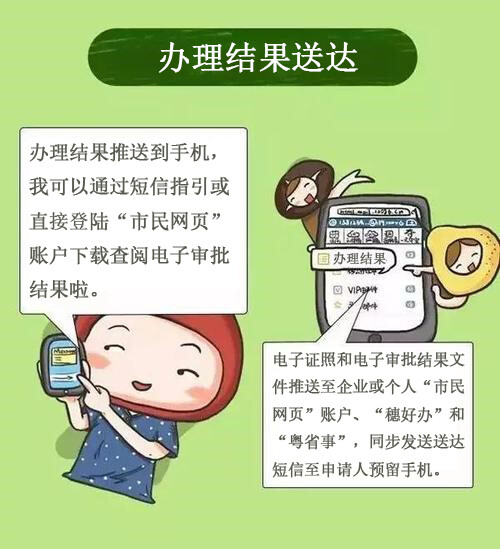 全流程网办案件办结后,电子证照和电子审批结果文件推送至企业或个人“市民网页”账户、“穗好办”和“粤省事”,同步发送送达短信至申请人预留手机。申请人通过短信指引或直接登陆“市民网页”账户下载查阅电子审批结果。