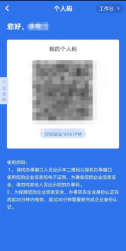 第二步:申请人在底部导航栏目点击“个人”,进入右上角“企业码/个人码”,点击“亮码办事”。