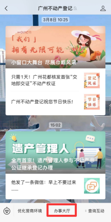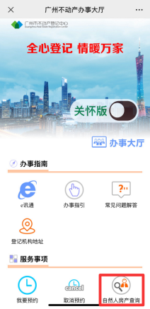 1.关注“广州不动产登记”微信公众号,选择“办事大厅”,再选择“自然人房产查询”;