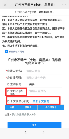 2. 阅读查询须知,并勾选“我已阅读并同意”,输入申请人信息、身份证号码,可选填曾用名、子女信息,点击“确定”按钮提交,完成人脸识别认证后,即可获取查询结果。市民选择输入自己的曾用名和未成年子女信息,查询结果将一并显示自己名下(含曾用名)不动产信息和未成年子女(含曾用名)不动产信息。