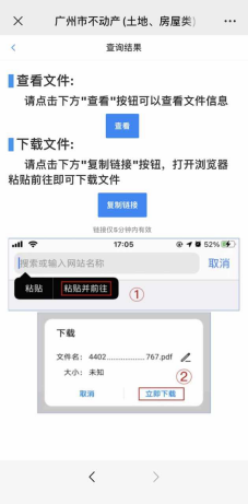 5.反馈实时查询结果。可选择“查看”预览查询结果或者“复制链接”打开浏览器粘贴前往即可下载查询结果PDF文件。
