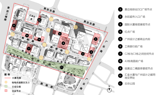 推荐点位:黄边地铁站D口广场节点、永旺超市入口广场、国际大厦南塔景观节点、红点广场、广州设计之都商业内街、工商银行前广场、C2栋及C3栋之间空间节点、A3栋南面前广场、临黄边二横路旁景观节点、云谷公园、场地内各个道路交叉口等。