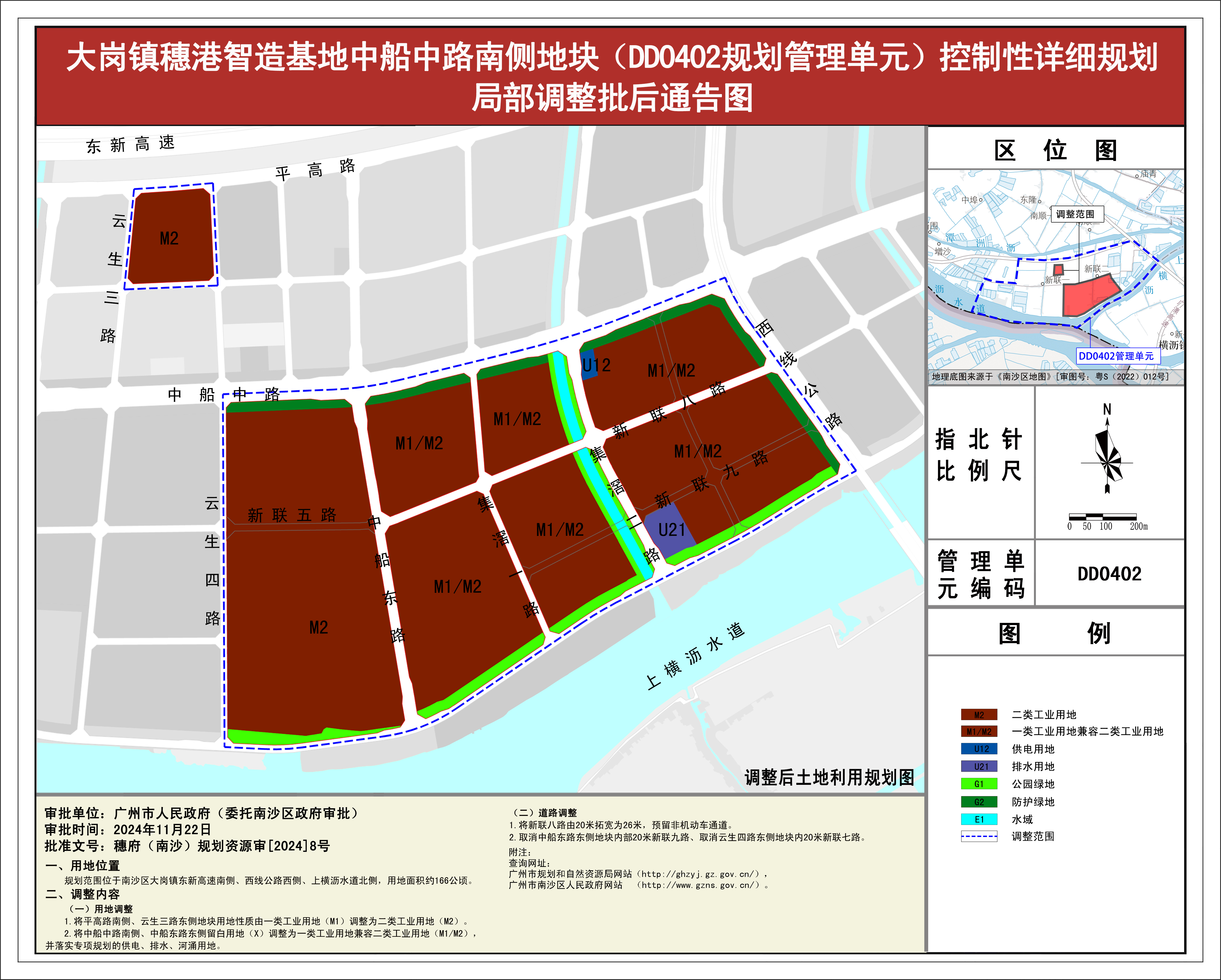 根据《广东省城市控制性详细规划管理条例》《广州市城乡规划程序规定》有关规定,《大岗镇穗港智造基地中船中路南侧地块(DD0402规划管理单元)控制性详细规划局部调整》已完成规划技术审查、批前公示等程序,并经广州市南沙新区自然资源规划与利用委员会审议通过后获广州市南沙区人民政府(受广州市人民政府委托)批准(穗府(南沙)规划资源审〔2024〕8号),自批准之日(2024年11月22日)起生效。
