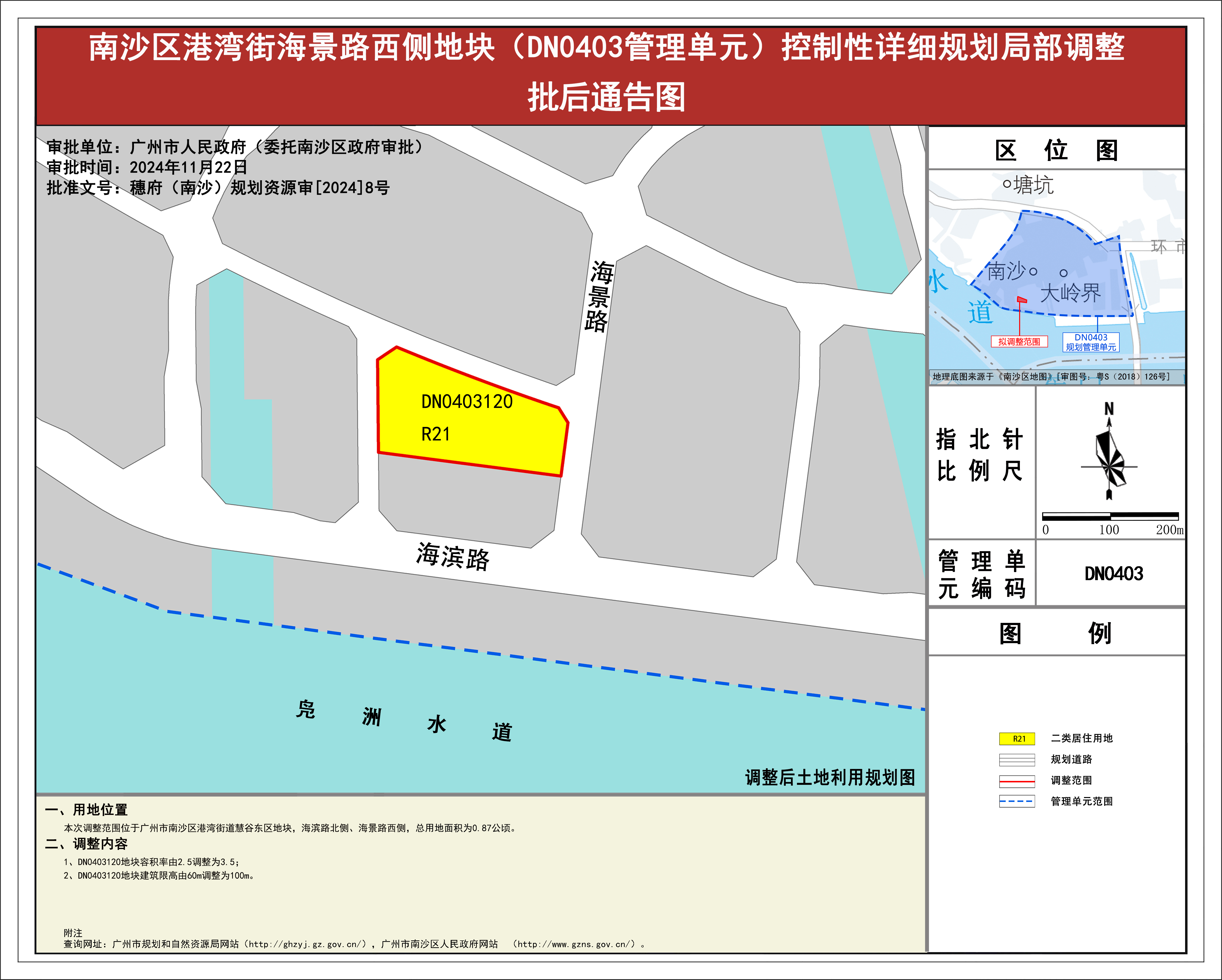 根据《广东省城市控制性详细规划管理条例》《广州市城乡规划程序规定》有关规定,《南沙区港湾街海景路西侧地块(DN0403规划管理单元)控制性详细规划局部调整》已完成规划技术审查、批前公示等程序,并经第一届广州市南沙新区自然资源规划与利用委员会(利用委)2024年第五次会议审议通过后,获广州市南沙区人民政府(受广州市人民政府委托)批准(穗府(南沙)规划资源审〔2024〕8号),自批准之日(2024年11月22日)起生效。