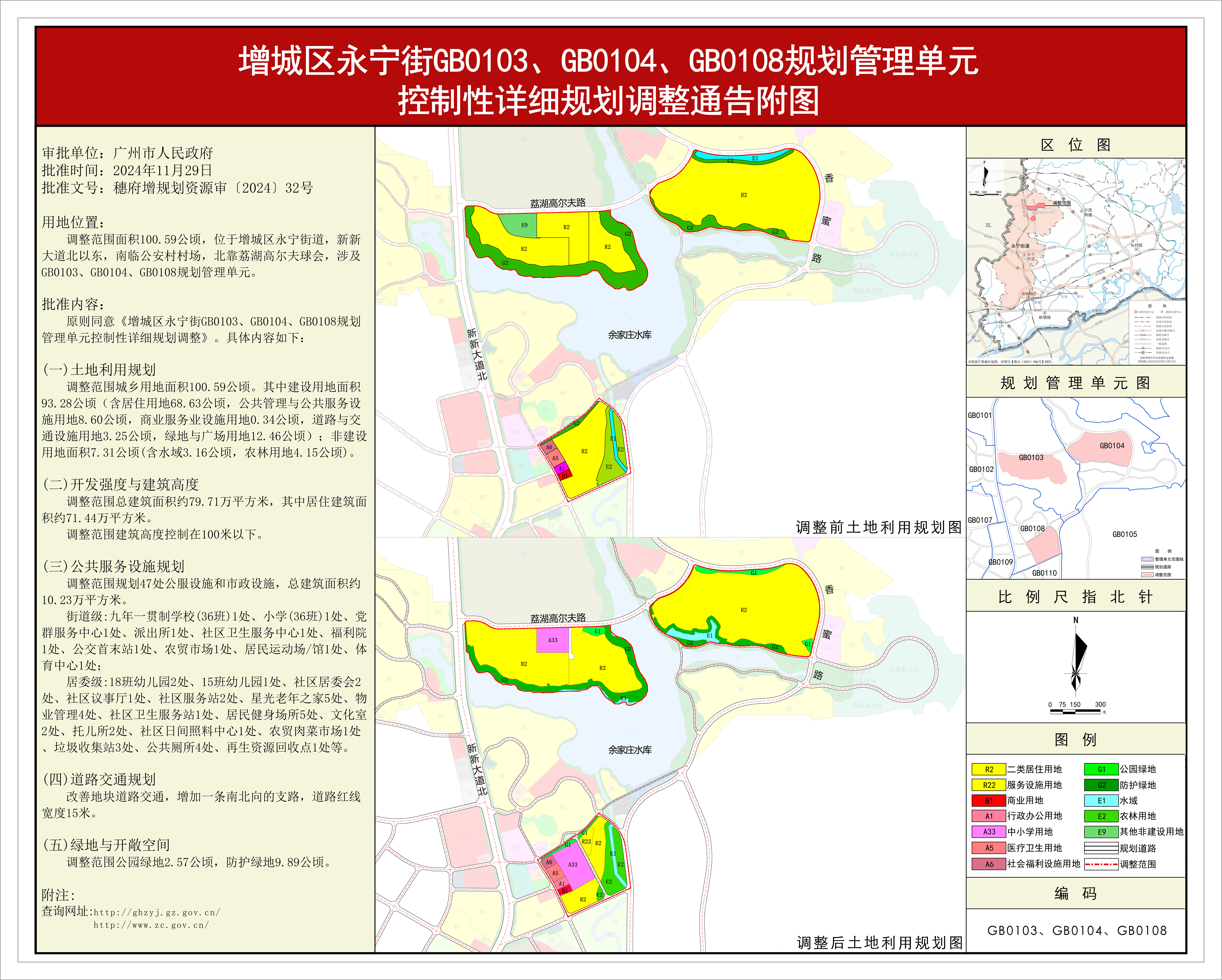 根据《广东省城市控制性详细规划管理条例》等规定,《增城区永宁街GB0103、GB0104、GB0108规划管理单元控制性详细规划调整》已完成规划技术审查、批前公示等程序,并经2024年增城区、增城经济技术开发区建筑环境与交通市政专业委员会第十八次会议审议通过后获广州市人民政府批准(穗府增规划资源审〔2024〕32号),自批准之日(2024年11月29日)起生效。