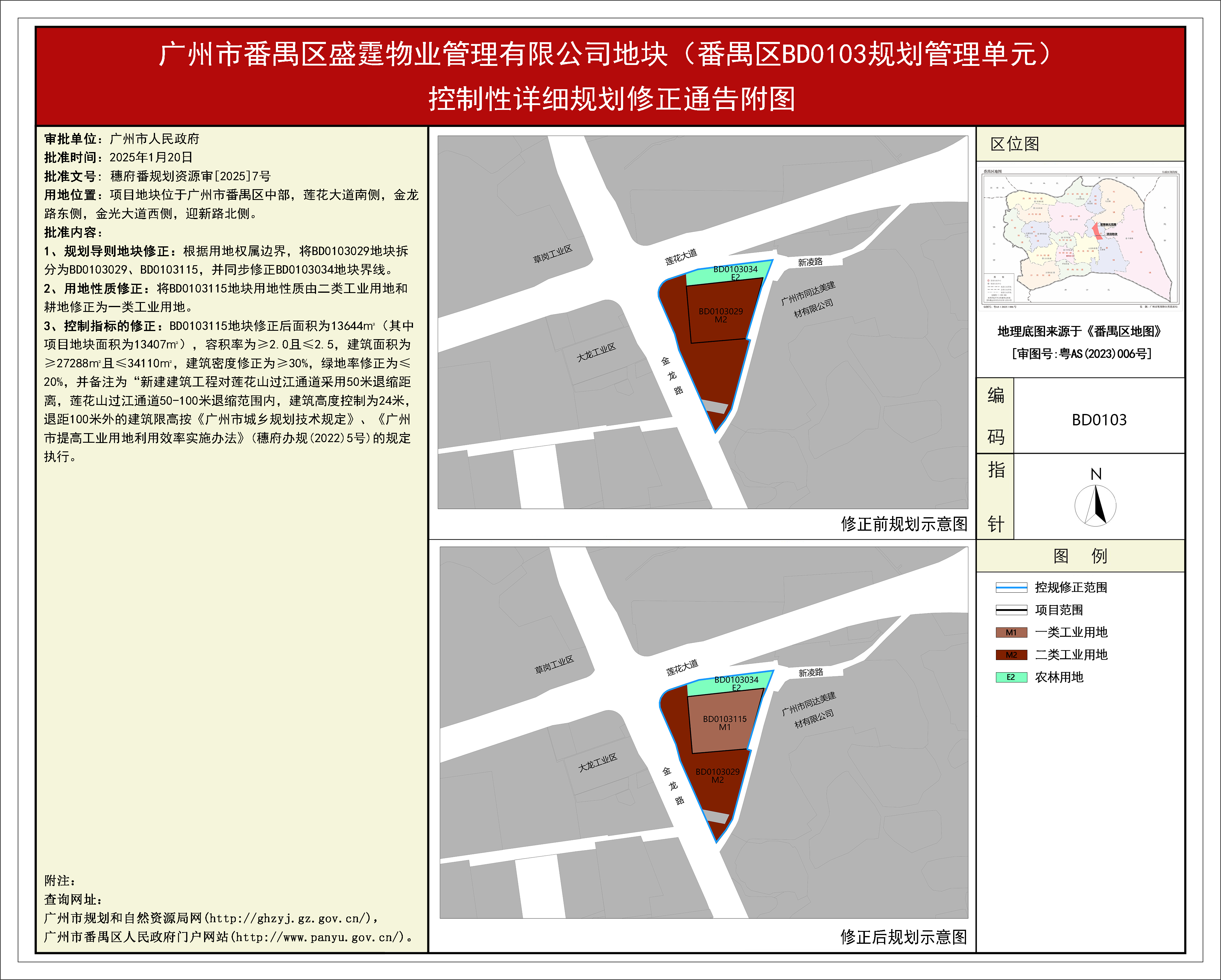 根据《广东省城市控制性详细规划管理条例》,《广州市番禺区盛霆物业管理有限公司地块(番禺区BD0103规划管理单元)控制性详细规划修正》规划成果已完成规划技术审查、批前公示、征询相关单位意见等程序,并经番禺区土地和规划领导小组会议审议通过后获广州市人民政府批准(穗府番规划资源审[2025]7号),自批准之日(2025年1月20日)起生效。