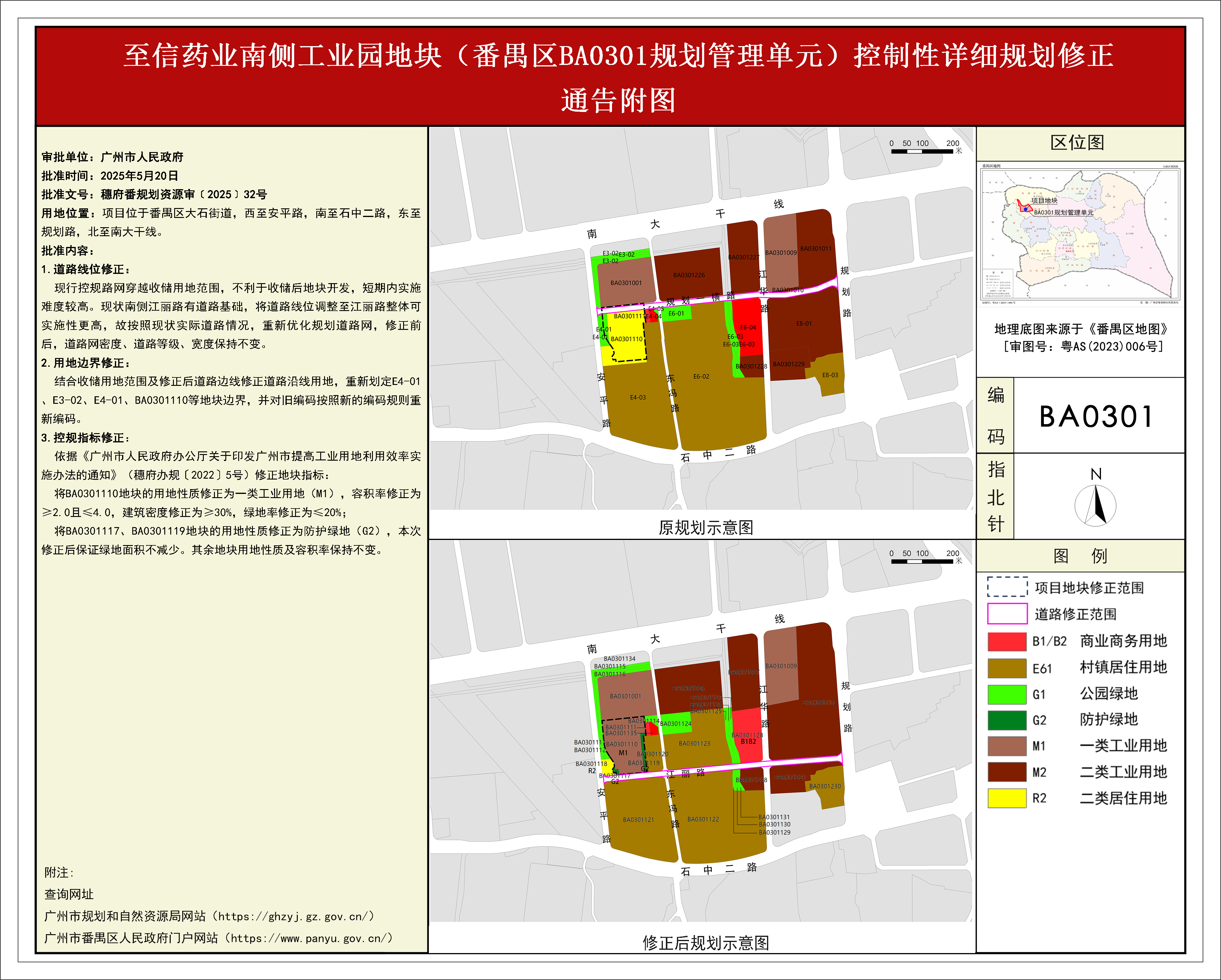 根据《广东省城市控制性详细规划管理条例》、《广州市人民政府关于将一批市级行政职权事项继续委托区实施的决定》(穗府〔2019〕8号)、《广州市人民政府关于收回一批市级行政权力事项的决定》(广州市人民政府令第188号),《至信药业南侧工业园地块(番禺区BA0301规划管理单元)控制性详细规划修正》规划成果已完成批前公示,并经番禺区政府常务会议(土地和规划专题)审议通过后,番禺区人民政府受广州市人民政府委托批准,自批准之日(2025年5月20日)起生效。
