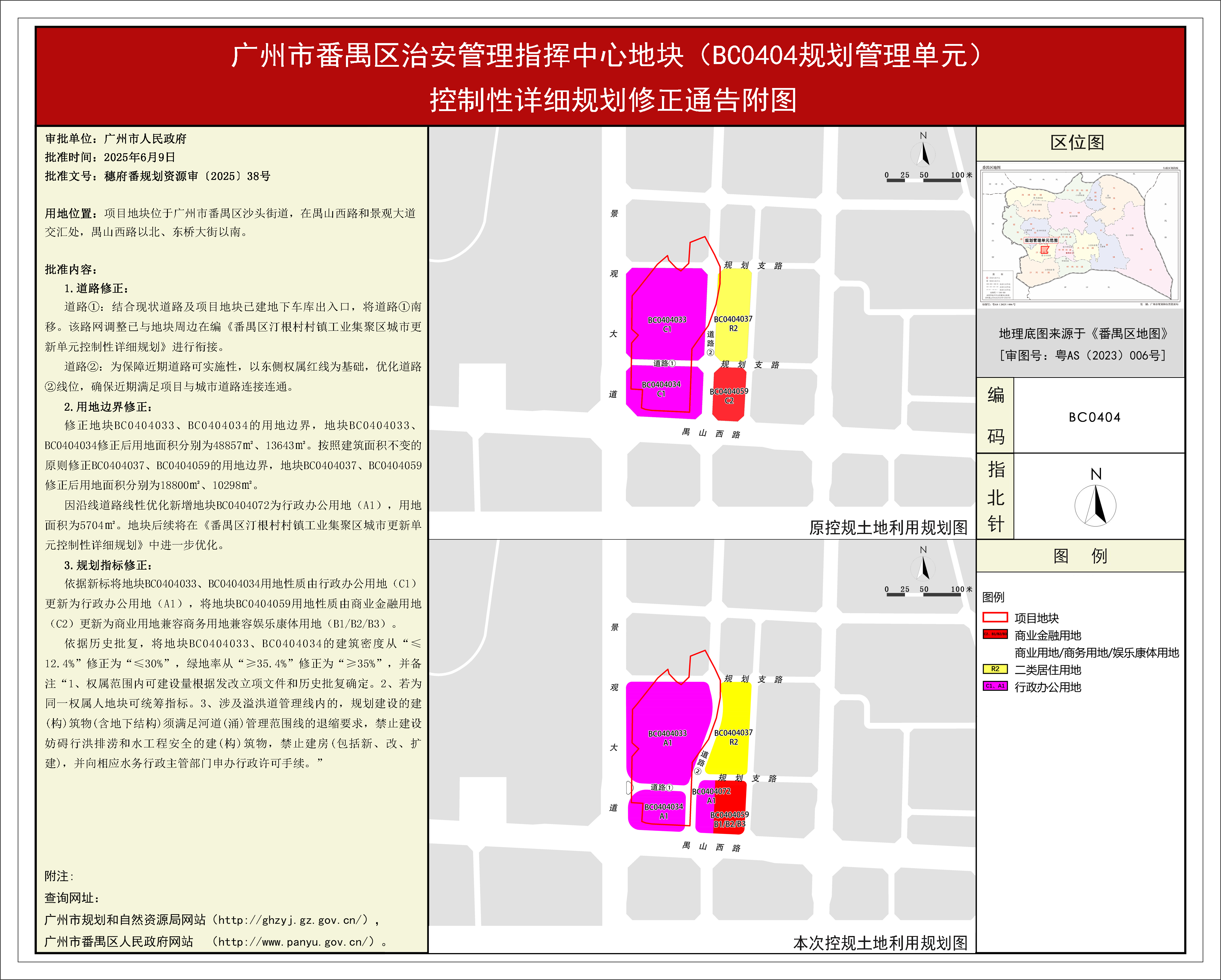 根据《广东省城市控制性详细规划管理条例》、《广州市番禺区治安管理指挥中心地块(BC0404规划管理单元)控制性详细规划修正》规划成果已完成规划技术审查、批前公示、征询相关单位意见等程序,并经番禺区常务会议审议通过后获广州市人民政府批准(穗府番规划资源审﹝2025﹞38号),自批准之日(2025年6月9日)起生效。