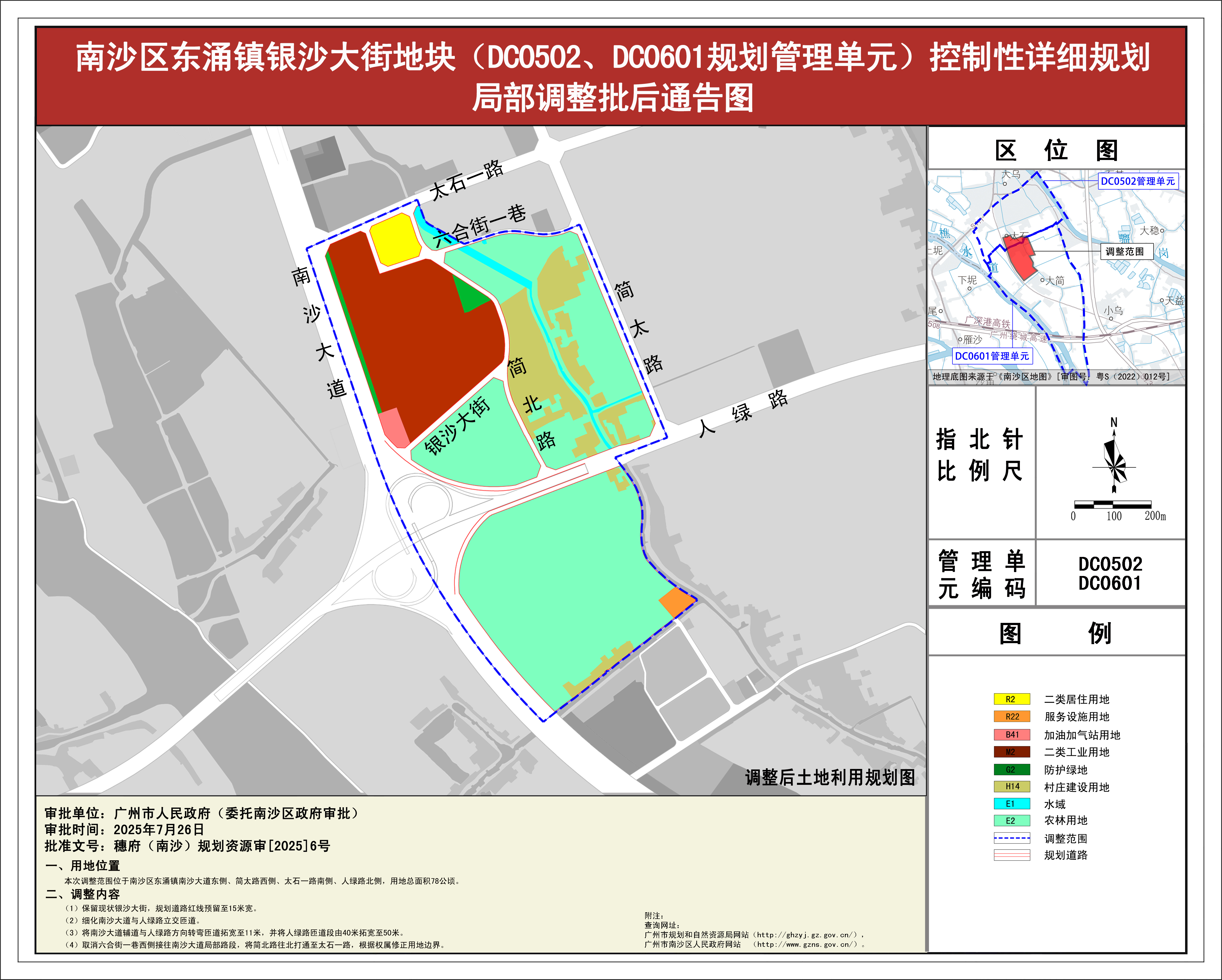 根据《广东省城市控制性详细规划管理条例》《广州市城乡规划程序规定》有关规定,《南沙区东涌镇银沙大街地块(DC0502、DC0601规划管理单元)控制性详细规划局部调整》已完成规划技术审查、批前公示等程序,并经广州市南沙新区自然资源规划与利用委员会审议通过后获广州市南沙区人民政府(受广州市人民政府委托)批准(穗府(南沙)规划资源审〔2025〕6号),自批准之日(2025年7月26日)起生效。