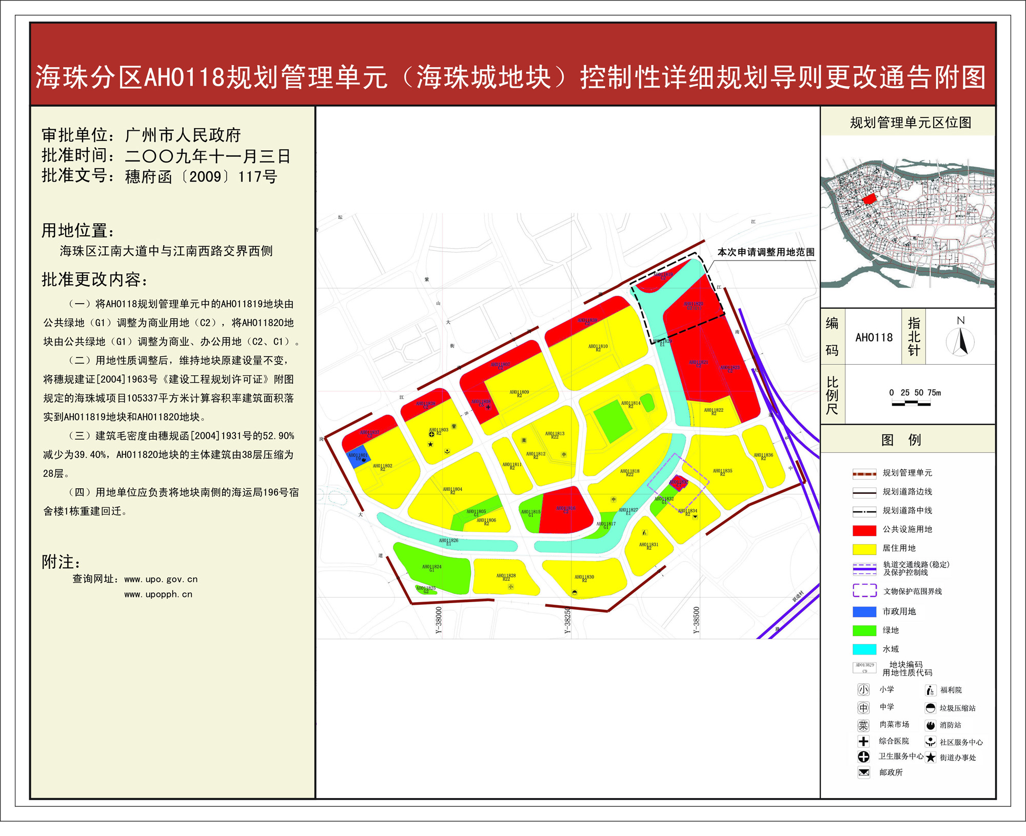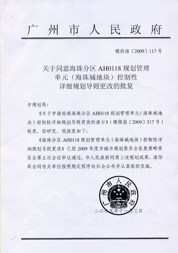 关于同意海珠分区AH0118规划管理单元(海珠城地块)控制性详细规划导则更改的批复