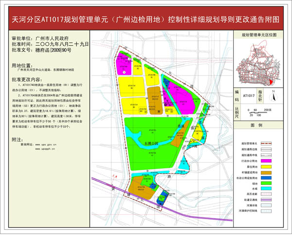 根据《广东省城市控制性详细规划管理条例》,《天河分区AT1017规划管理单元(广州边检用地)控制性详细规划导则更改》一项规划方案已完成广州市规划局审查、批前公示等程序,并经广州市城市规划委员会审议通过后获广州市人民政府批准(穗府函〔2009〕90号)。