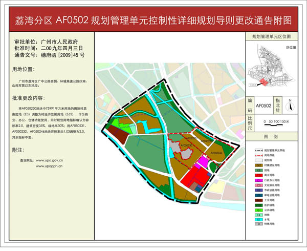 根据《广东省城市控制性详细规划管理条例》,黄埔分区AP0203、AP0206规划管理单元(广州本田黄埔工厂及周边地区)控制性详细规划导则更改、海珠分区AH1001规划管理单元(中国电信广州数据中心用地)控制性详细规划导则更改、芳村分区AF0502规划管理单元(海南村经济发展用地)控制性详细规划导则更改、芳村分区AF0215规划管理单元(东漖联社用地)控制性详细规划导则更改、天河分区AT0208规划管理单元(广东省韶钢集团广州信息研发总部项目)控制性详细规划导则更改、白云分区AB2112规划管理单元(广州市动物防疫监督所用地)控制性详细规划导则更改六项方案已完成广州市规划局审查、批前公示等程序,并经广州市城市规划委员会审议通过后获广州市人民政府批准。