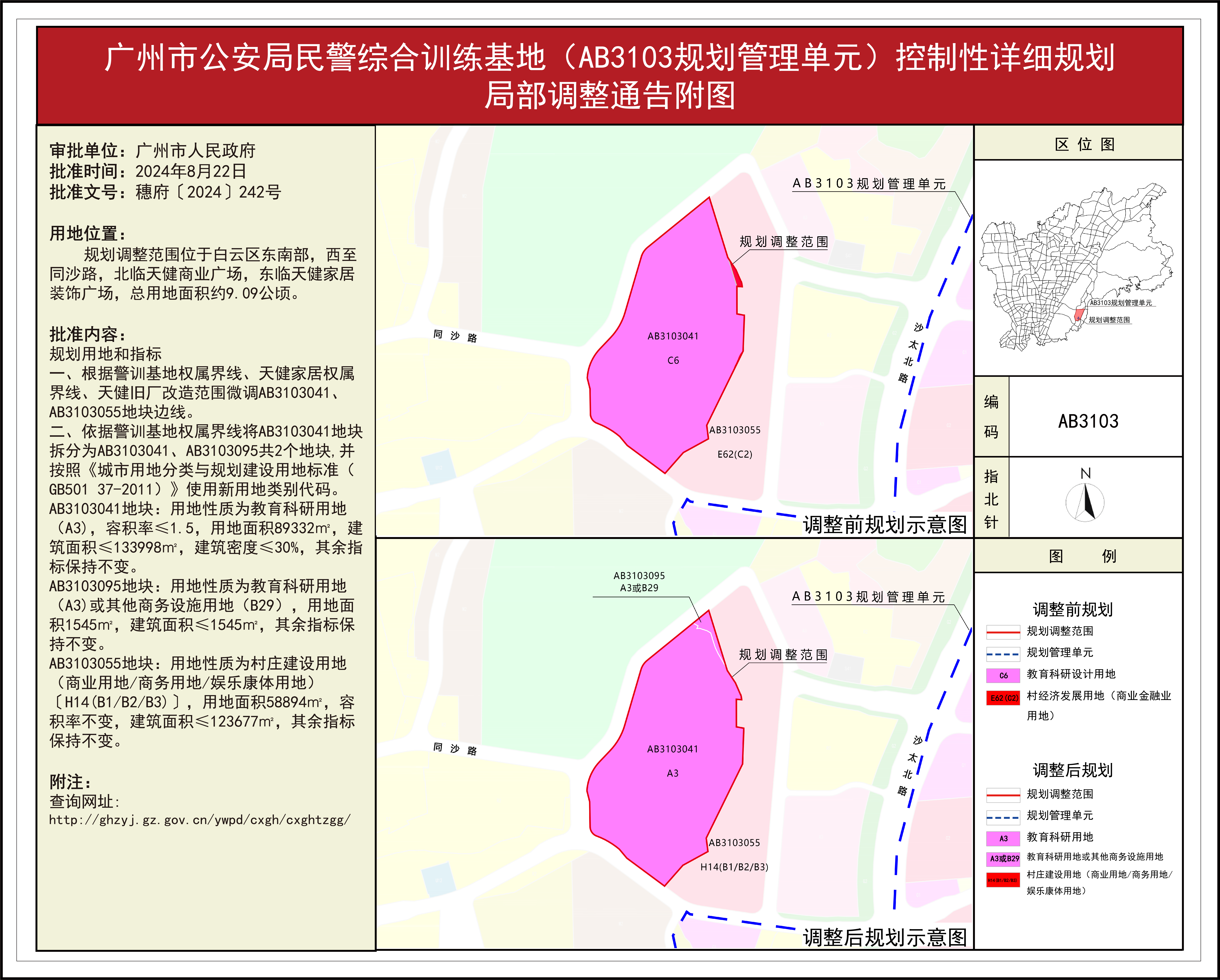 根据《广东省城市控制性详细规划管理条例》,《白云区钟落潭赤安路地块(AB0805、AB0810规划管理单元)控制性详细规划局部调整》《广州市公安局民警综合训练基地(AB3103规划管理单元)控制性详细规划局部调整》2项规划成果已完成编制、审查、公示等程序,由广州市规划委员会审议通过后经广州市人民政府批准(穗府函〔2024〕242号),自批准之日(2024年8月22日)起生效。