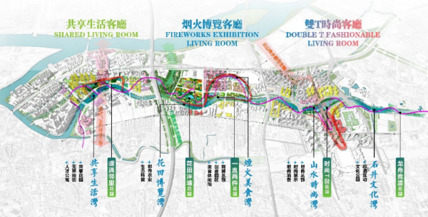1、通过展贸休闲体验轴串联总部中心、展贸中心、消费中心,各功能组团沿河展开、拥河发展。