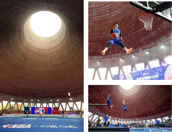 大跳台旁边1978年建成的首钢电厂发电循环水冷却塔。是冬奥会期间谷爱凌、苏翊明夺金的“背景墙”。首钢园创新性地利用冷却塔特有的通风结构,结合首钢园的冬奥IP,经过一系列设计改造,将冷却塔打造成独树一帜的工业风篮球公园。冷却塔内部,设置了两块全尺寸篮球场。环绕塔内一周,设置为观众看台。改造后的环形工业风篮球公园,成为业余训练、专业比赛和品牌推广等活动的热门场地,为篮球爱好者和品牌推广商等各类受众提供别具一格的活动空间。