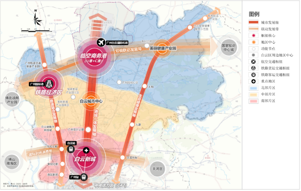 五年来,白云空间持续优化逐步形成多中心、组团式、网络化的“三轴两带三区”空间发展格局。南部依托白云新城、广州设计之都、白云湖数字科技城、广州湾区新岸(罗冲围片区)等载体,大力发展总部办公、数字经济及会议展览、研发设计、检验检测、人力资源服务等专业服务业,提升文化创意、旅游休闲、健康养老等生活性服务业水平,打造总部经济和国际商贸集聚区。中部结合民营科技园核心区、白云城市中心、广州国际港,重点发展智能制造、科创孵化、跨境物流、直播电商、数字贸易、新型消费等现代商贸及都市消费工业,前瞻布局战略性新兴产业和未来产业,打造高能级综合功能服务核心。北部依托白云国际机场、民营科技园东区和西区等,做大做强智能装备与机器人、新能源与新型储能、智能网联与新能源商用车、智能建造与工业化建筑、美丽健康、时尚智造、生物制造等先进制造业,以及航空维修与制造、商贸会展等临空产业,打造先进制造业基地、临空经济示范区。