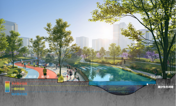 设计团队立足项目资源禀赋,围绕“文蓝绿共融”,在珠江西岸绘就历史与自然共生的活力水岸新画卷。一是赓续历史文脉,显化场所精神,构建完整连续的历史景观体系。二是打造诗意栖居,沿珠江后航道、大冲口涌、沙涌突出开放共享的滨水界面,重构人与自然和谐共生的交互场景,提升人居环境。三是坚持生态韧性,通过保护生物多样性、落实“海绵城市”理念、打造韧性岸线边界等措施构建弹性绿色的生态格局。
