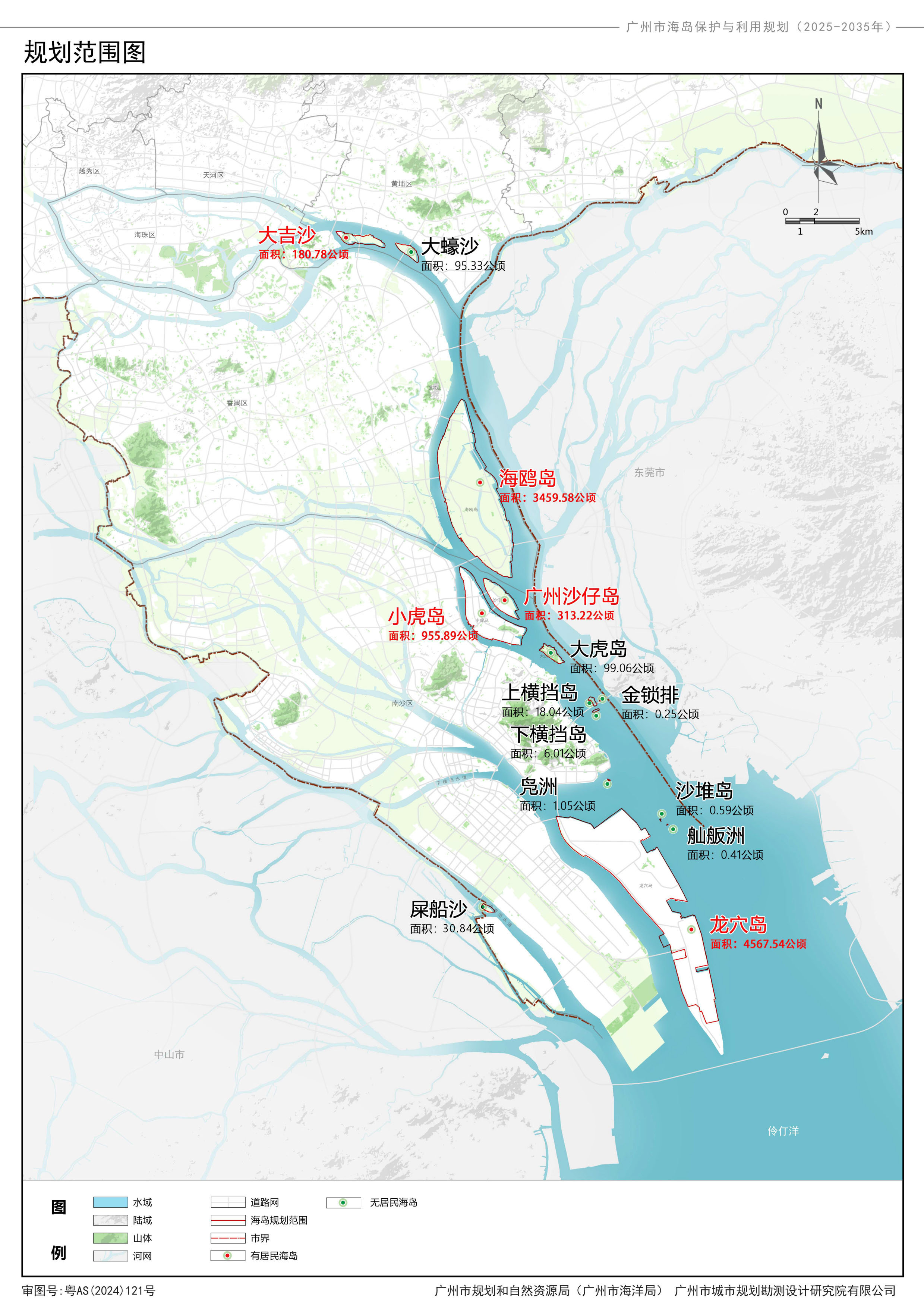 规划范围包括广州市行政辖区内全部海岛,共计14个。包括大吉沙、海鸥岛、广州沙仔岛、小虎岛和龙穴岛等5个有居民海岛和大蠔沙、大虎岛、上横挡岛、下横挡岛、金锁排、凫洲、舢舨洲、沙堆岛和屎船沙等9个无居民海岛。