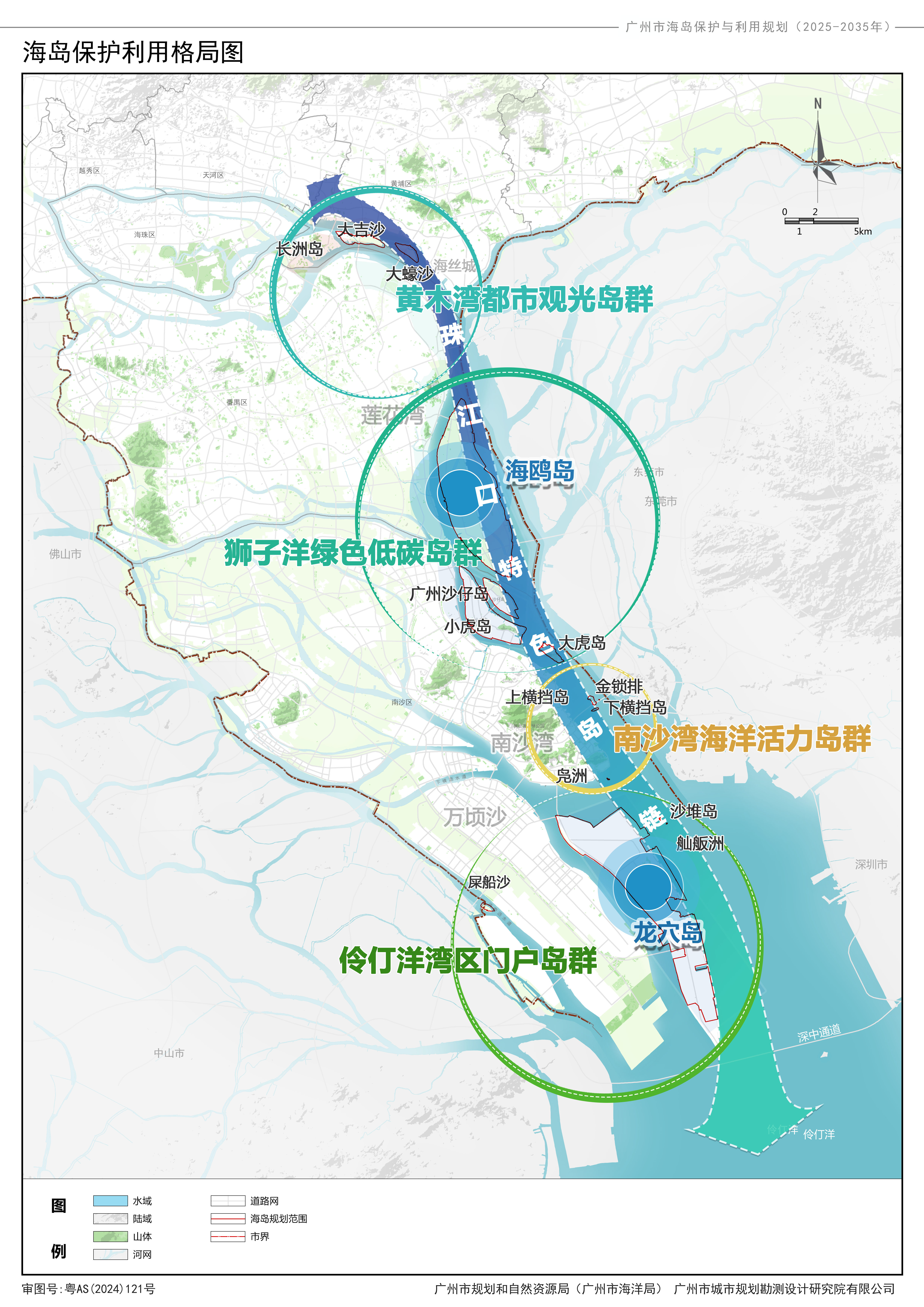 立足广州海岛资源空间分布及保护现状,根据《广东省海岸带及海洋空间规划(2021—2035年)》《广州市国土空间总体规划(2021—2035年)》对海岛分类保护利用的要求,为全面彰显海洋特色的现代化城市风貌,完善海洋城市的多元功能,以岸岛联动为发展方向,以岛群协同为工作重点,构建“一链四群,双核多点”的海岛保护利用格局。