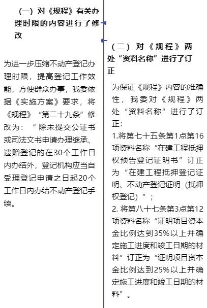 为进一步压缩不动产登记办理时限,提高登记工作效能,方便群众办事,我委依据《实施方案》要求,将《规程》“第二十九条”修改为:“ 除未提交公证书或司法文书申请办理继承、遗赠登记的在30个工作日内办结外,登记机构应当自受理登记申请之日起20个工作日内办结不动产登记手续。”