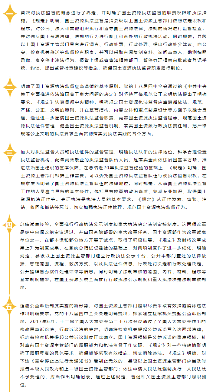 魏莉华表示,《规定》对国土资源执法监督做出了多项制度规定,其中五大亮点值得关注: