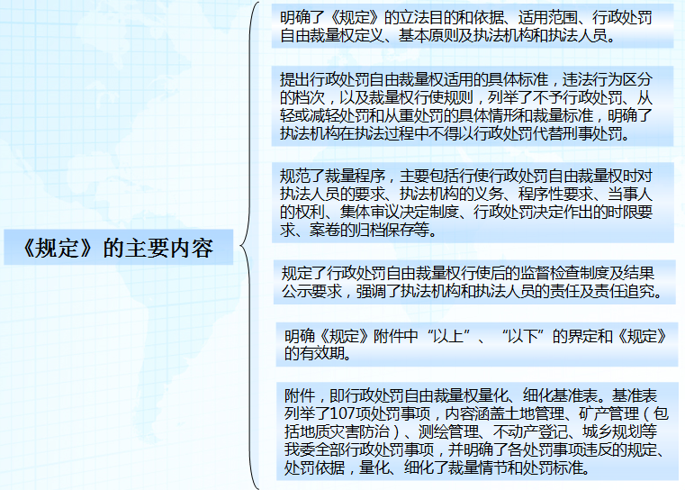 (一)立足全面。《规定》从自由裁量权行使的原则,裁量标准,裁量规则,裁量程序以及监督检查等几个方面规范国土资源和规划管理领域行政处罚自由裁量权的行使,在规定的内容方面,做到全面、完善。