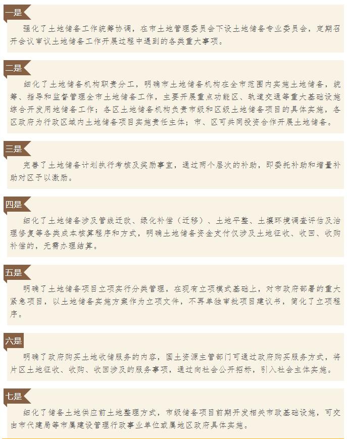 《办法》从总则、规划和计划、资金管理、项目实施、前期开发、储备土地管理、附则等七章、三十六条内容规范土地储备行为。