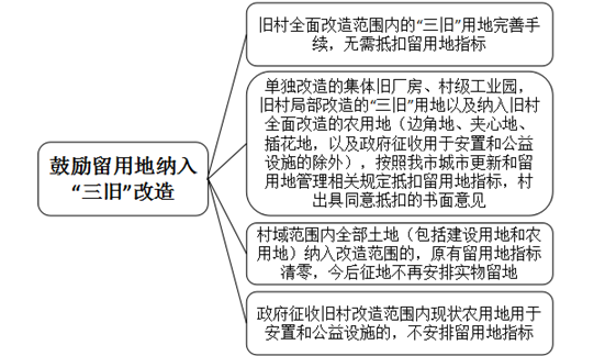 5.纳入“三旧”改造兑现留用地。《工作意见》第二(六)点明确了将留用地指标纳入旧村改造兑现的相关内容,包括旧村全面改造、单独改造、全村域改造涉及的留用地指标抵扣和政府征收新增产生留用地的抵扣问题。