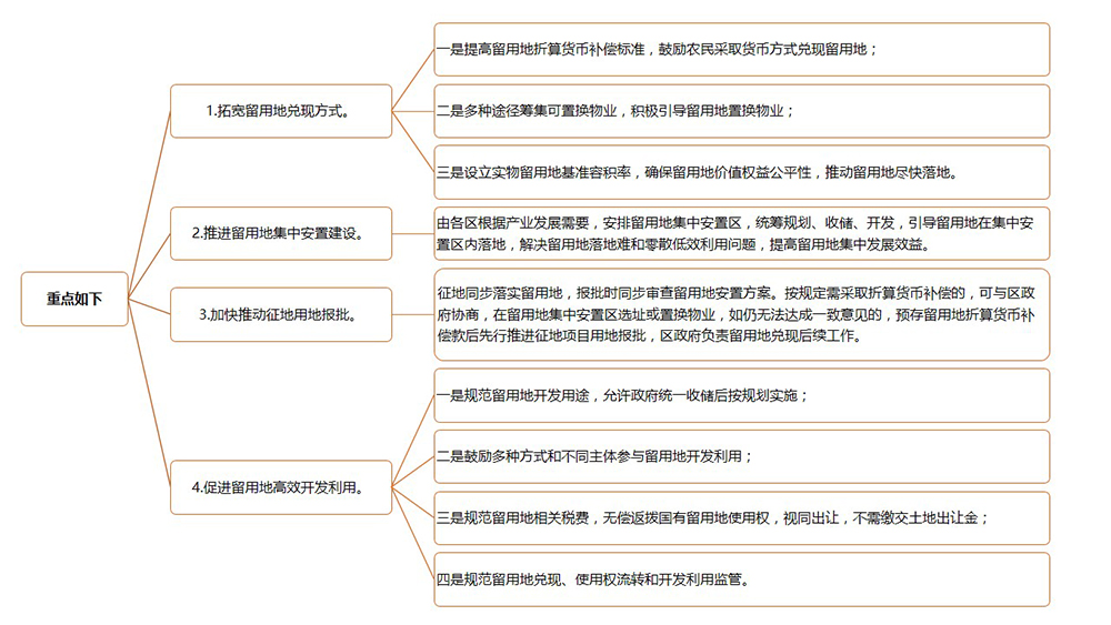 4.促进留用地高效开发利用。一是规范留用地开发用途,允许政府统一收储后按规划实施;二是鼓励多种方式和不同主体参与留用地开发利用;三是规范留用地相关税费,无偿返拨国有留用地使用权,视同出让,不需缴交土地出让金;四是规范留用地兑现、使用权流转和开发利用监管。