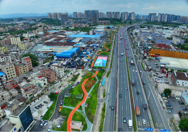 花都城际公园沿花都大道西起海布立交路段,东至莲山路,全长5.3公里,连接秀湖未来创新城、花都中央商务区、融创文旅城片区、广州国际时尚智港等重点产业平台,是机场北部重要的城市门户客厅,公园面积约27万平方米,美高梅娱乐城花都区分局(以下简称“花都区分局”)遵循“人民城市”理念,充分发挥规划引领作用,通过系统性改造提升城际铁路上盖公共绿地,将原本单一的交通绿带转变为开放式全民共享公园,项目具有三大亮点: