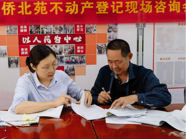 因项目早期资料保留较为混乱复杂,为尽快将代表房屋合法权益的产权证发到侨民手上,花都区分局的业务骨干到项目现场为侨民答疑解惑,协助准备相关材料并直接现场受理。这场暖心行动,温暖了不动产登记咨询会的现场,更点亮了侨民们十余年的办证希望。侨北苑旁的树阴下人声鼎沸,侨港苑舞台前熙熙攘攘,侨兴苑的篮球场热闹非凡。泛黄折旧的文件不断从侨民的袋子中掏出,工作人员逐字逐句认真检查,以通俗易懂的“大白话”向侨民讲解办证流程。侨民们带着疑问来、扬起笑脸走。