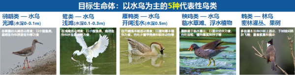 二是目标物种的精准服务通过区域生物群落详尽调研,构建了能服务于约4万只迁徙鸟类的多维生境系统,设计了光滩、浅滩、水塘、草滩及密林灌丛等多样化生境。