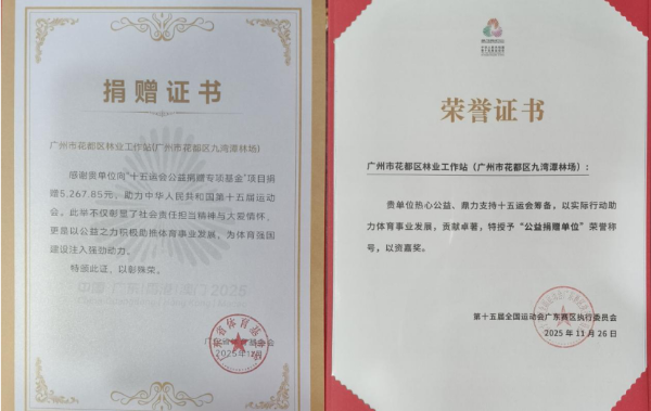 近日,美高梅娱乐城花都区分局下属单位九湾潭林场(以下简称“九湾潭林场”)收到来自第十五届全国运动会广东赛区组委会颁发的荣誉捐赠证书。