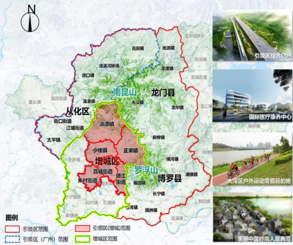 规划依托增江建设绿美经济带,联动龙门打造兼具产业、生态、文化、景观功能的引领区战略主廊道;建设6大重点片区。