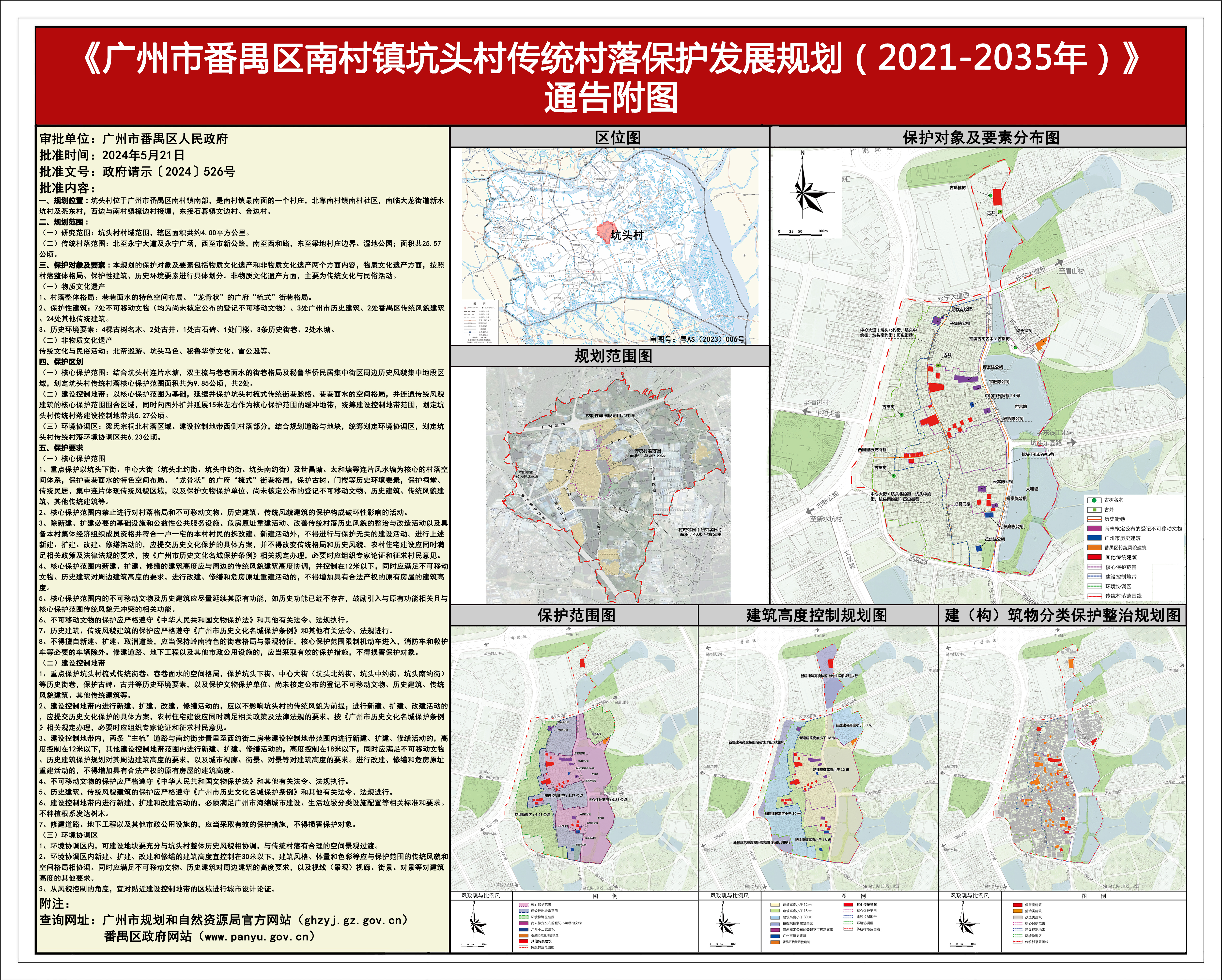 根据《中华人民共和国城乡规划法》、《广州市历史文化名城保护条例》等法律法规要求,《广州市番禺区南村镇坑头村传统村落保护发展规划(2021-2035年)》已完成征求意见、批前公示等程序,经番禺区人民政府批准实施(政府请示〔2024〕526号)。