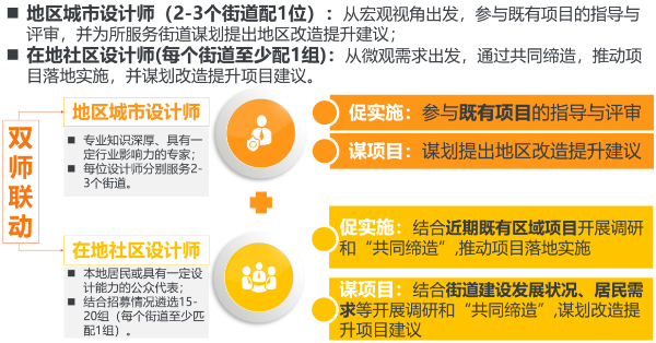 越秀区创新构建“地区城市设计师 + 在地社区设计师”双师联动工作矩阵,形成宏观与微观协同的治理网络。地区城市设计师从全区发展目标出发,为 2-3 个街道提供改造提升战略指导;在地社区设计师则扎根街道,以“共同缔造”模式推动民生项目落地。这种“自上而下”与“自下而上”的双向联动,已在社区小公园改造、历史文化街区更新等项目中显现成效,实现从“政府主导”到“多元共治”的治理转型。