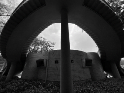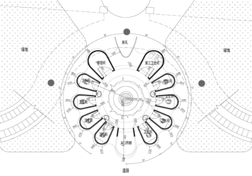 环形屋檐下,公厕室内、外空间若即若离,营造出“坚韧简约”的整体风格。木棉的花瓣自然形成厕所空间,内部采用开放式天井布局,通过竖槽分隔提高室内采光与空气流通,既保证了公厕的通风,又保护了使用者的隐私。