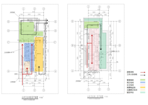 设计师团队打通内部闲置杂物房增加公厕厕位,同时优化公厕内部流线并增设了工具间及第三卫生间,大大提升了公厕的空间功能。不仅如此,还通过设置多功能厚墙的方式,匿藏清洁用房的工具存贮功能,做到在有限的场地内,最大化提升市民用厕体验。