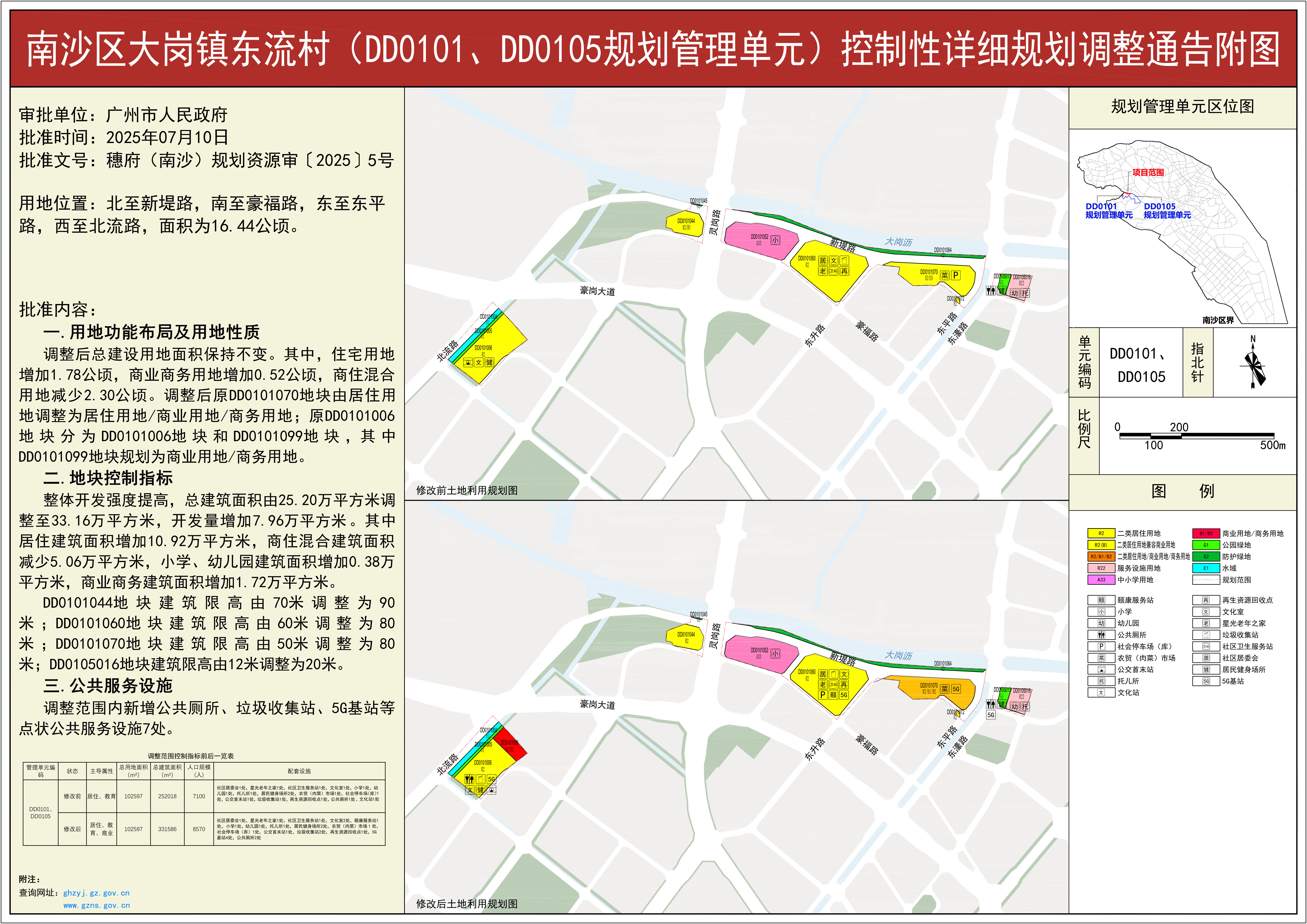 根据《广东省城市控制性详细规划管理条例》、广州市城乡规划程序有关规定,《南沙区大岗镇东流村(DD0101、DD0105管理单元)控制性详细规划调整》已完成规划技术审查、批前公示等程序,并经广州市南沙新区自然资源规划与利用委员会审议通过后获广州市南沙区人民政府(受广州市人民政府委托)批准(穗府(南沙)规划资源审〔2025〕5号),自批准之日(2025年7月10日)起生效。