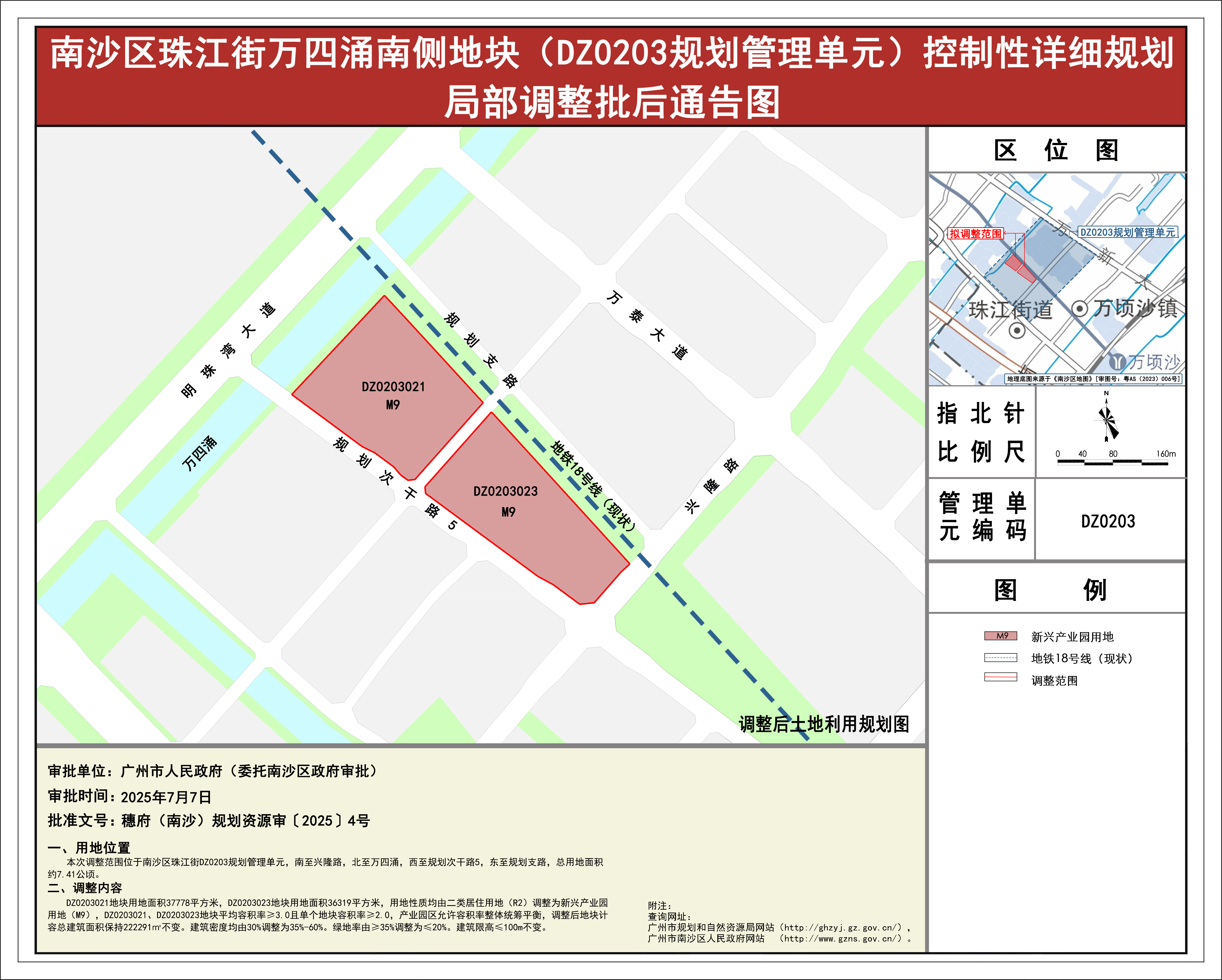 根据《广东省城市控制性详细规划管理条例》《广州市城乡规划程序规定》有关规定,《南沙区珠江街万四涌南侧地块(DZ0203规划管理单元)控制性详细规划局部调整》已完成规划技术审查、批前公示等程序,并经广州市南沙新区自然资源规划与利用委员会审议通过后获广州市人民政府批准(穗府(南沙)规划资源审〔2025〕4号),自批准之日(2025年7月7日)起生效。