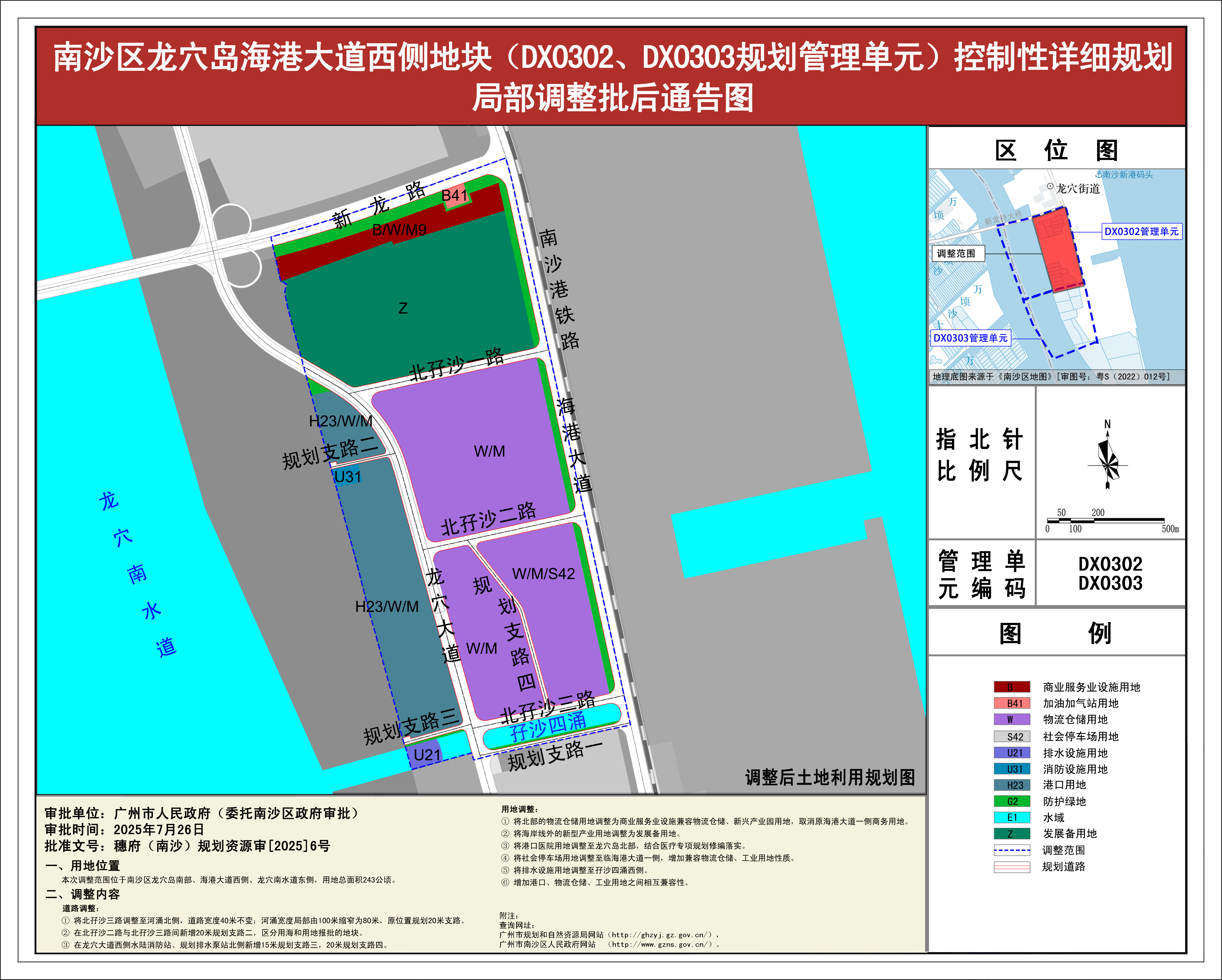 根据《广东省城市控制性详细规划管理条例》《广州市城乡规划程序规定》有关规定,《南沙区龙穴岛海港大道西侧地块(DX0302、DX0303规划管理单元)控制性详细规划局部调整》已完成规划技术审查、批前公示等程序,并经广州市南沙新区自然资源规划与利用委员会审议通过后获广州市南沙区人民政府(受广州市人民政府委托)批准(穗府(南沙)规划资源审〔2025〕6号),自批准之日(2025年7月26日)起生效。