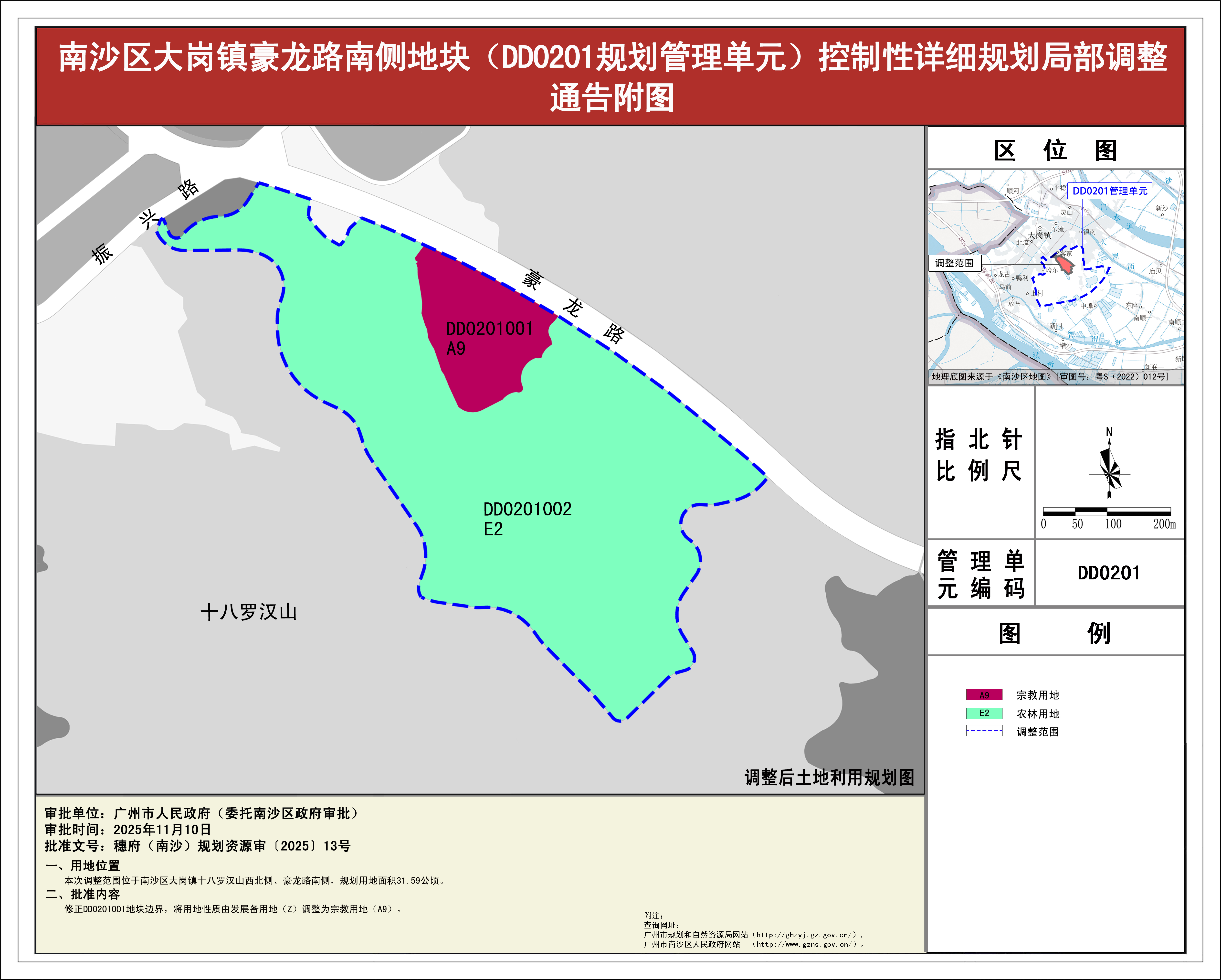 根据《广东省城市控制性详细规划管理条例》《广州市城乡规划程序规定》有关规定,《<广州市南沙区教育设施布点规划(2023-2035年)>详细规划“一张图”修改方案》《南沙区大岗镇豪龙路南侧地块(DD0201规划管理单元)控制性详细规划局部调整》两项规划成果已完成规划技术审查、征询意见公示等程序,并经广州市南沙新区自然资源规划与利用委员会审议通过后获广州市南沙区人民政府(受广州市人民政府委托)批准(穗府(南沙)规划资源审〔2025〕13号),自批准之日(2025年11月10日)起生效。