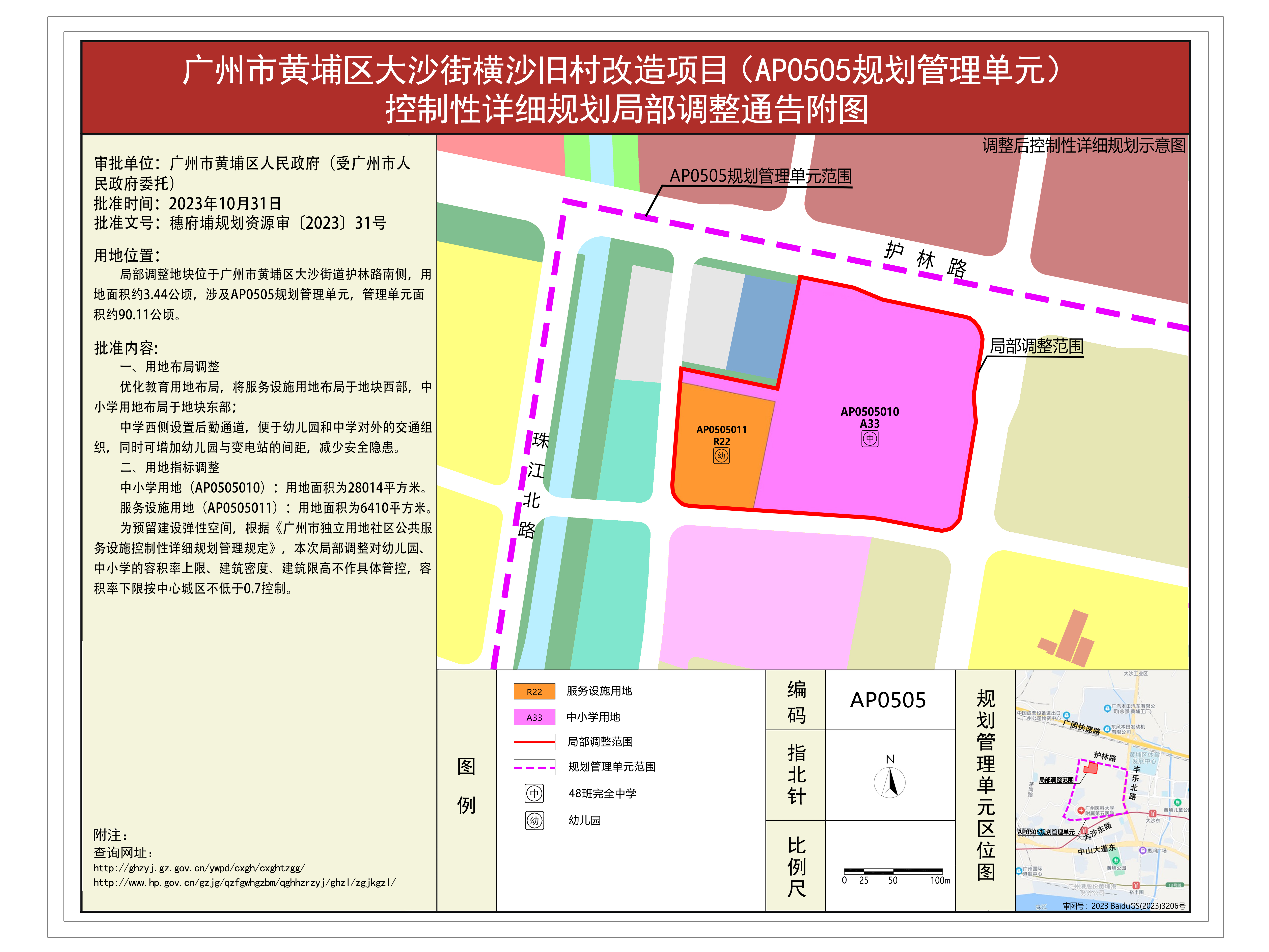 根据《广东省城市控制性详细规划管理条例》要求,《广州市黄埔区大沙街横沙旧村改造项目(黄埔区AP0505规划管理单元)控制性详细规划局部调整》已经广州市人民政府批准(穗府埔规划资源审〔2023〕31号),自批准之日(2023年10月31日)起生效。