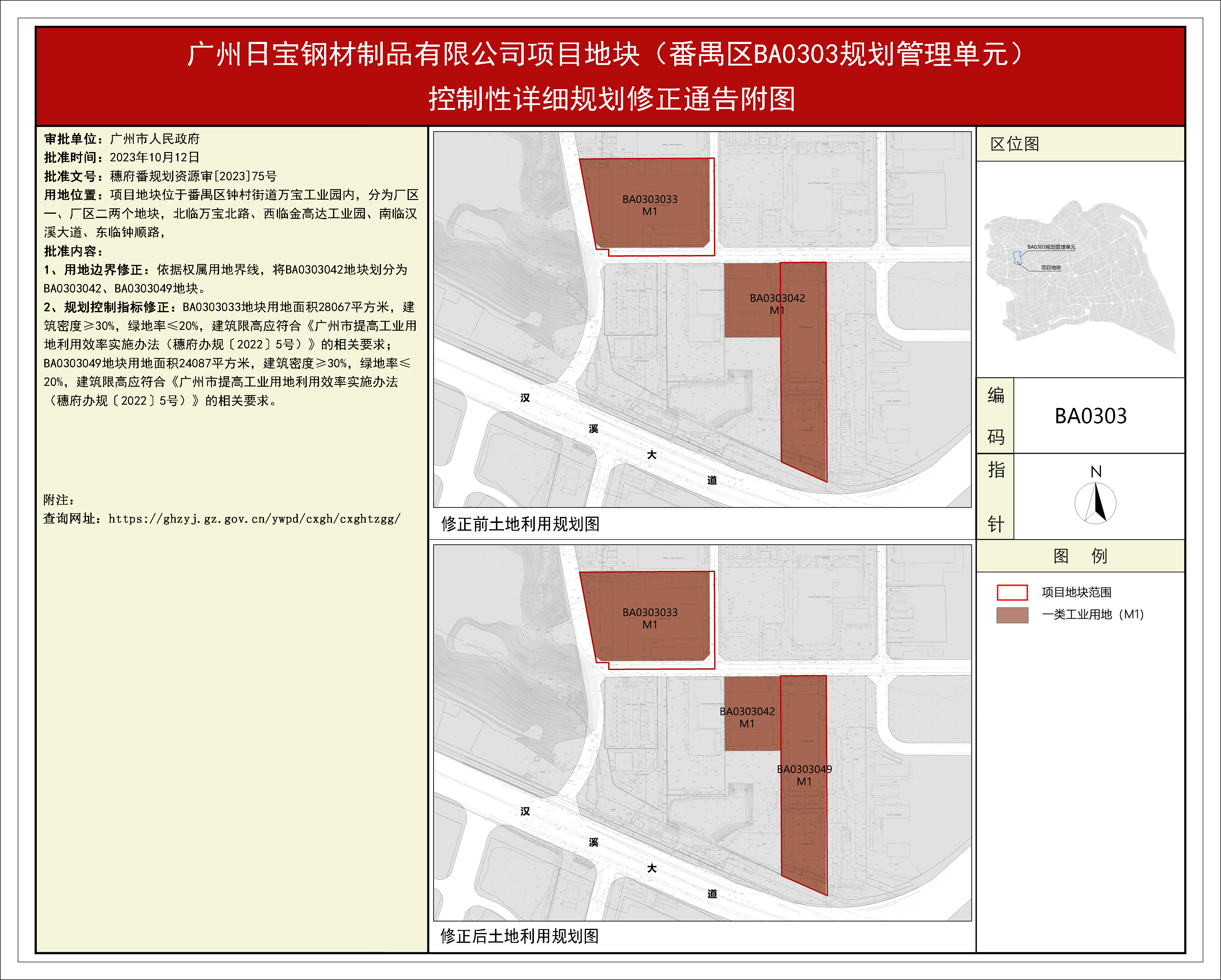 根据《广东省城市控制性详细规划管理条例》、《广州市人民政府关于将一批市级行政职权事项继续委托区实施的决定》(穗府[2019]8号)、《广州市人民政府关于收回一批市级行政权力事项的决定》(广州市人民政府令第188号),《广州日宝钢材制品有限公司项目地块(番禺区BA0303规划管理单元)控制性详细规划修正》规划成果已完成规划技术审查、批前公示等程序,并经番禺区土地和规划领导小组会议审议通过后获广州市人民政府批准,自批准之日(2023年10月12日)起生效。