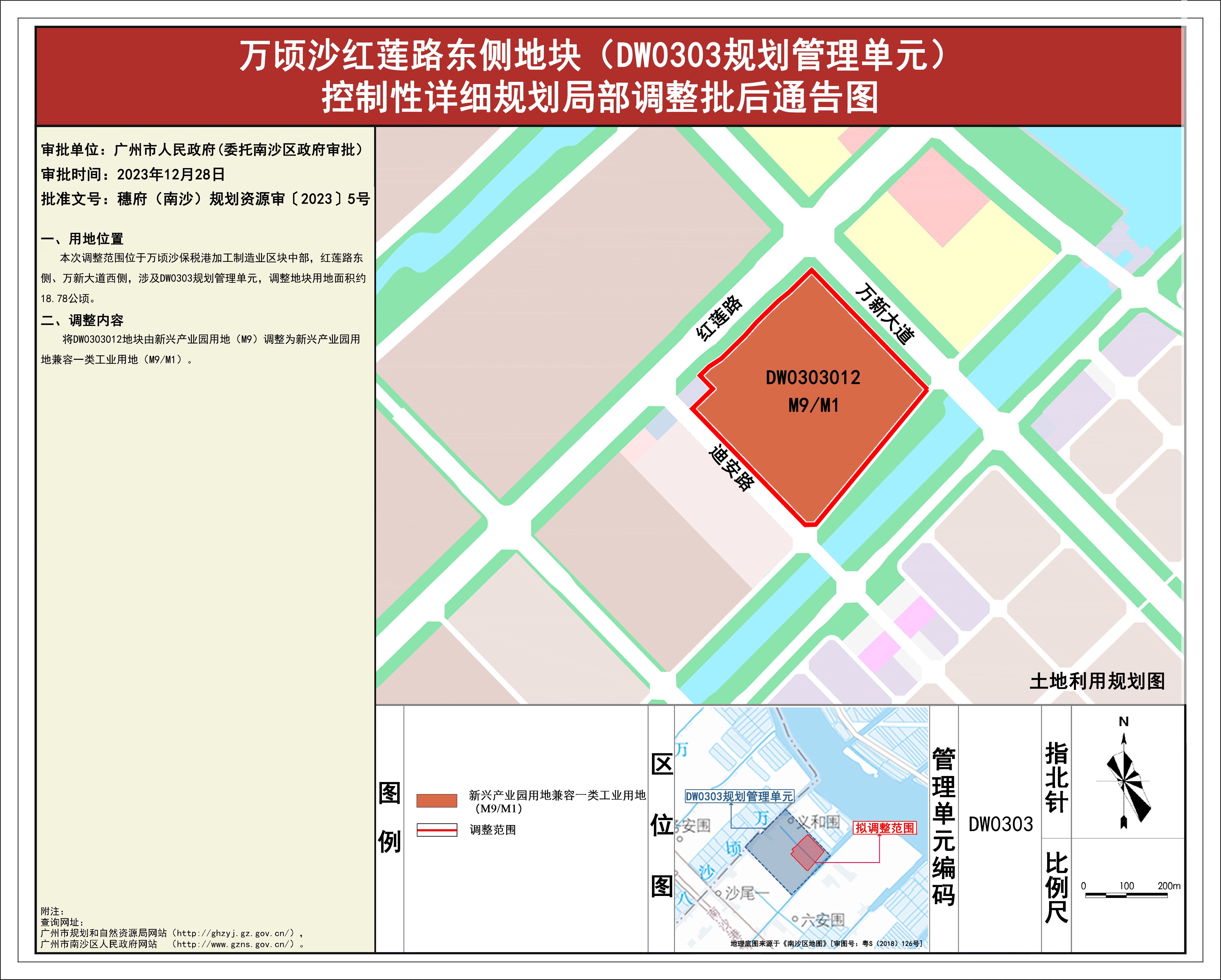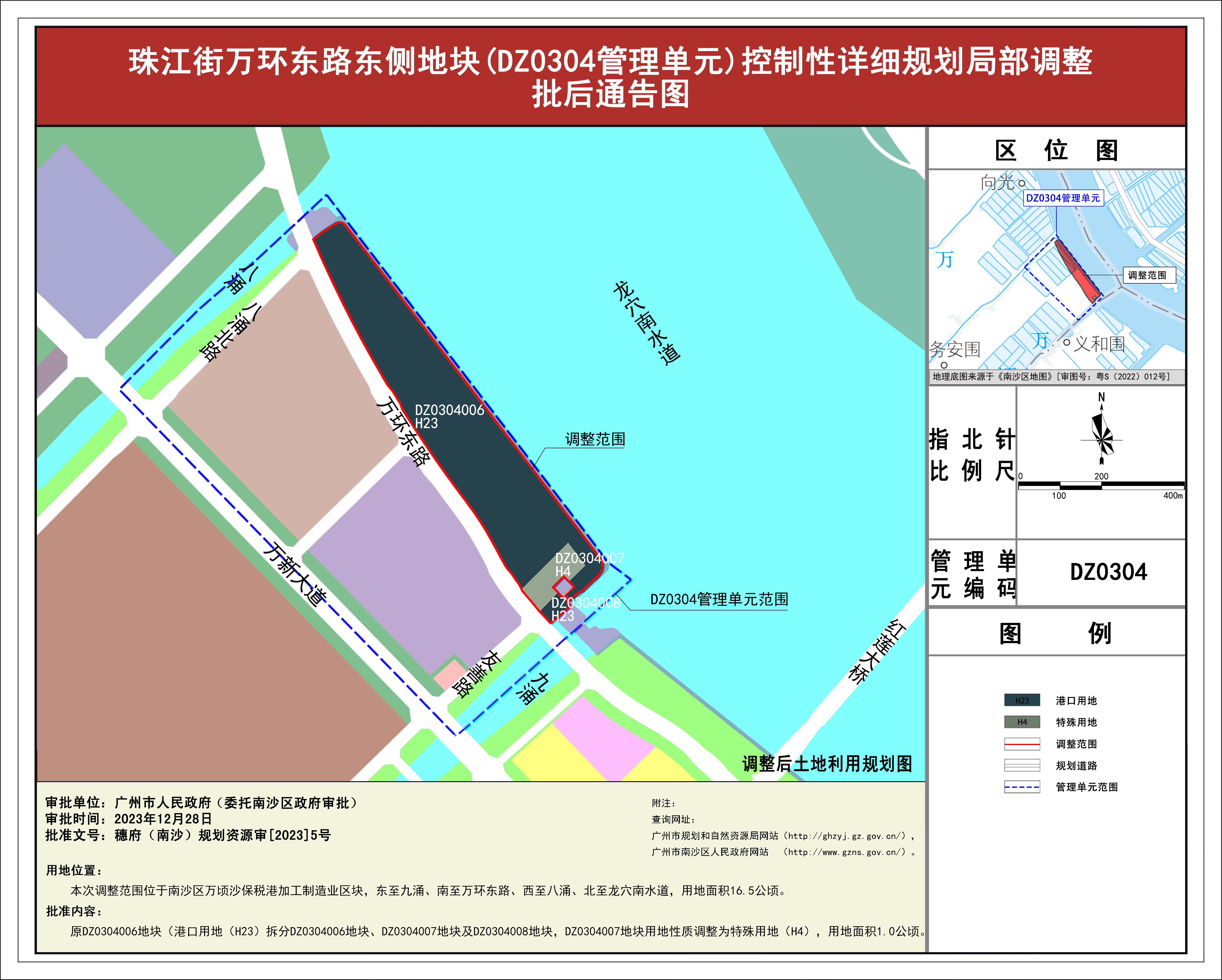 根据《广东省城市控制性详细规划管理条例》《广州南沙新区控制性详细规划制定办法》有关规定,《万顷沙红莲路东侧地块(DW0303)规划管理单元)控制性详细规划局部调整》《珠江街万环东路东侧地块(DZ0304管理单元)控制性详细规划局部调整》《南沙街明珠湾大桥东侧地块(DN0403管理单元)控制性详细规划局部调整》《东涌镇南涌村旧厂改造地块(DC0201、DC0202管理单元)控制性详细规划局部调整》《龙穴岛凫洲水道南侧地块(DX0102管理单元)控制性详细规划局部调整》《龙穴岛海港大道西侧地块(DX0303、DX0305规划管理单元)控制性详细规划局部调整》《南沙街大涌东路地块(DN0304规划管理单元)控制性详细规划局部调整》《南沙街海滨路北侧地块(DN0403管理单元)控制性详细规划局部调整》已完成规划技术审查、批前公示等程序,并经广州市南沙新区自然资源规划与利用委员会审议通过后获广州市南沙区人民政府(受广州市人民政府委托)批准(穗府(南沙)规划资源审〔2023〕5号),自批准之日(2023年12月28日)起生效。
