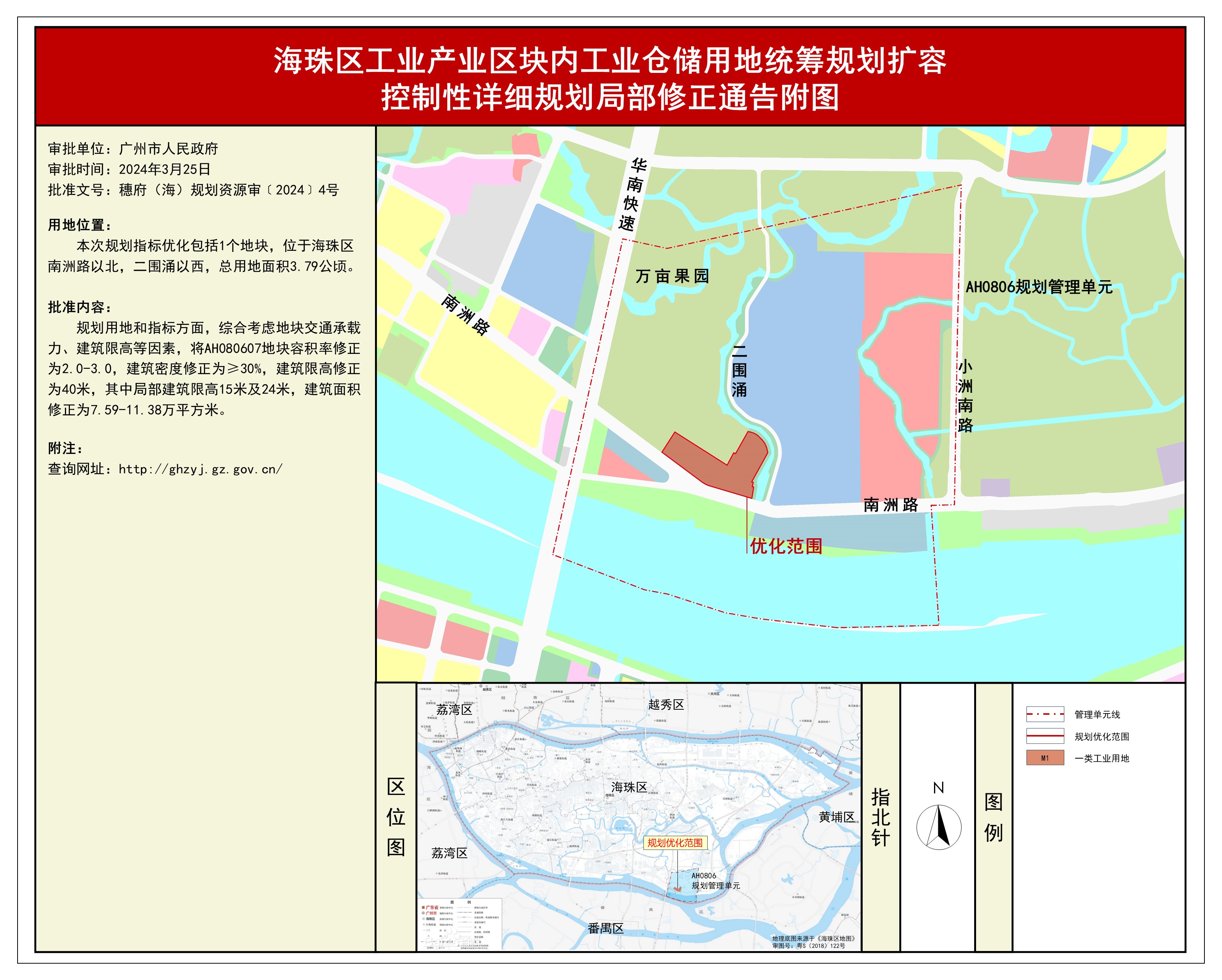根据《广东省城市控制性详细规划管理条例》,《海珠区工业产业区块内工业仓储用地统筹规划扩容控制性详细规划局部修正》规划成果经广州市海珠区城市规划领导小组会议审议通过后获广州市人民政府批准(穗府(海)规划资源审〔2024〕4号),自批准之日(2024年3月25日)起生效。
