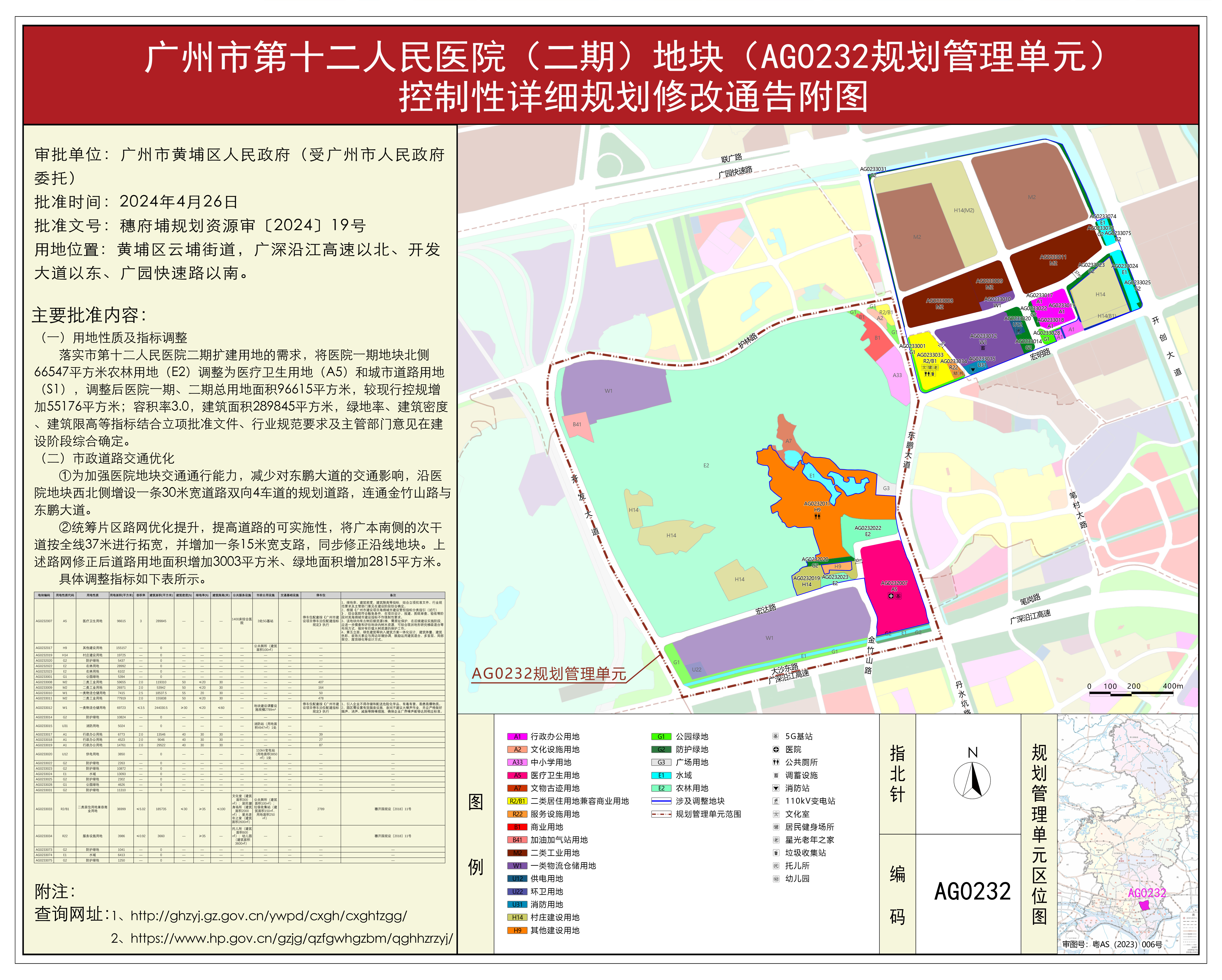 根据《广东省城市控制性详细规划管理条例》要求,《广州市第十二人民医院(二期)地块(AG0232规划管理单元)控制性详细规划修改》已完成规划技术审查、批前公示等程序,并经广州市黄埔区广州开发区城乡规划委员会审议通过后获黄埔区人民政府(受市人民政府委托)批准(穗府埔规划资源审〔2024〕19号),自批准之日(2024年4月26日)起生效。