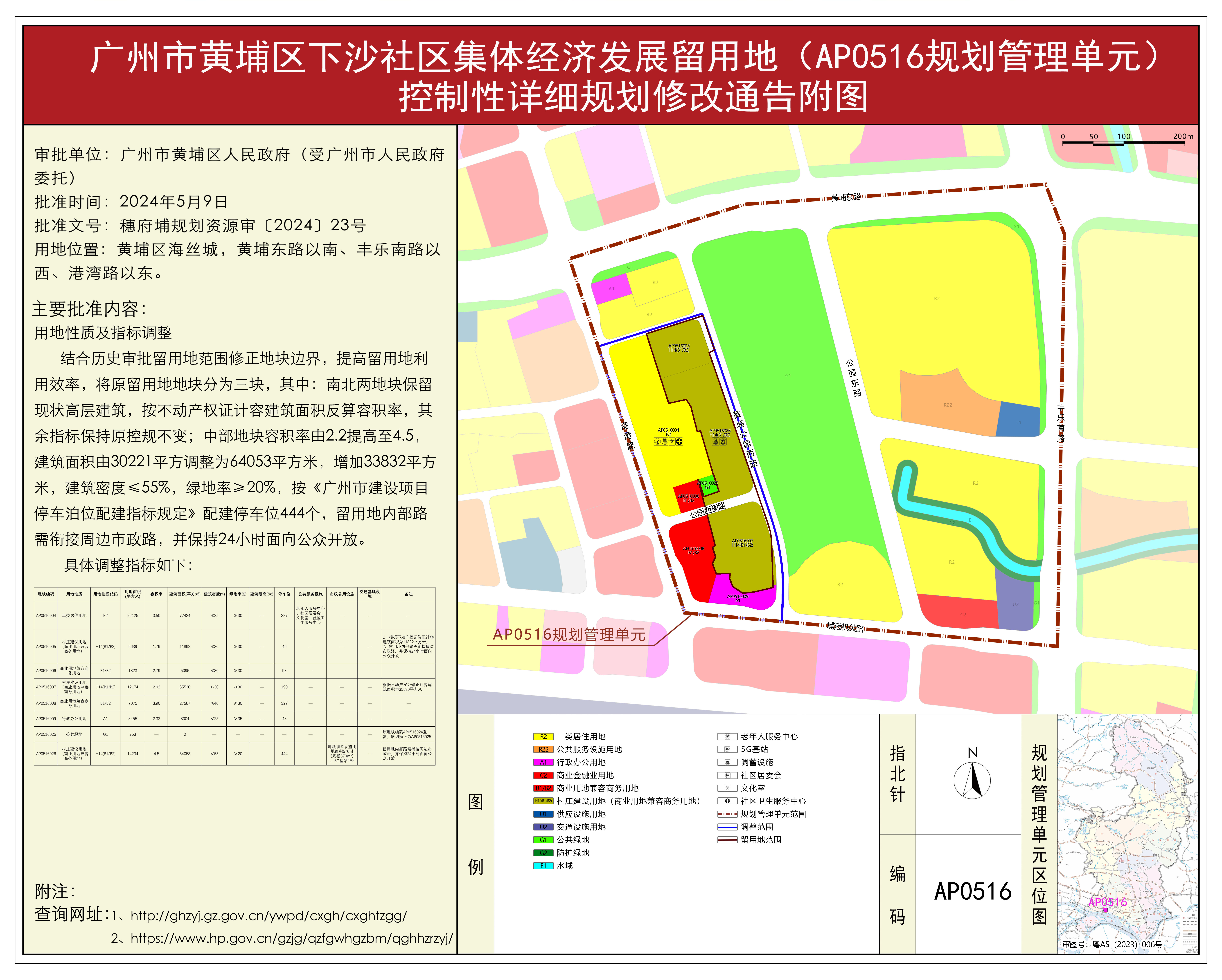 根据《广东省城市控制性详细规划管理条例》要求,《广州市黄埔区下沙社区集体经济发展留用地(AP0516规划管理单元)控制性详细规划修改》已完成规划技术审查、批前公示等程序,并经广州开发区、广州市黄埔区城乡规划委员会专家和公众代表委员会议审议通过后获黄埔区人民政府(受市人民政府委托)批准(穗府埔规划资源审〔2024〕23号),自批准之日(2024年5月9日)起生效。
