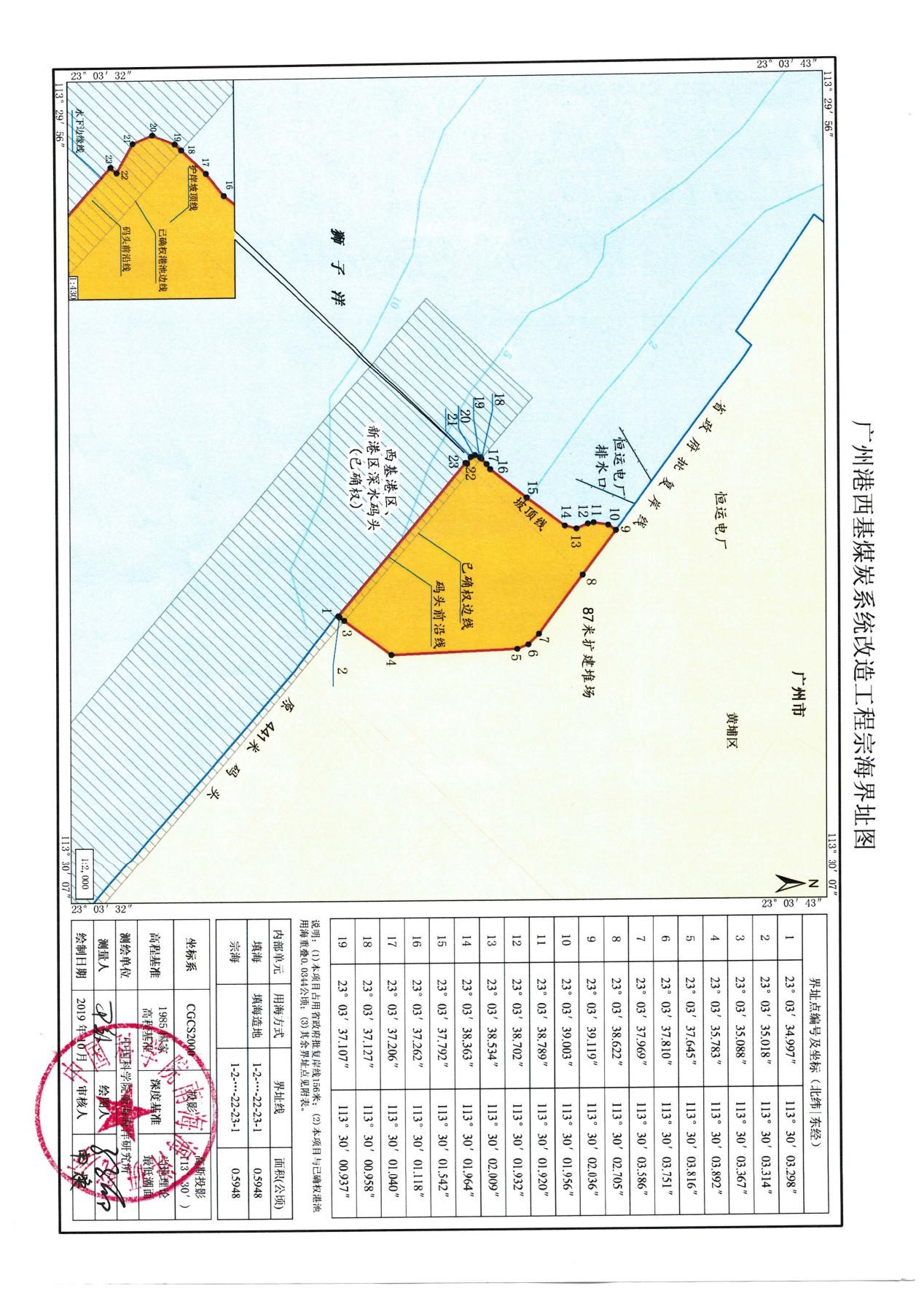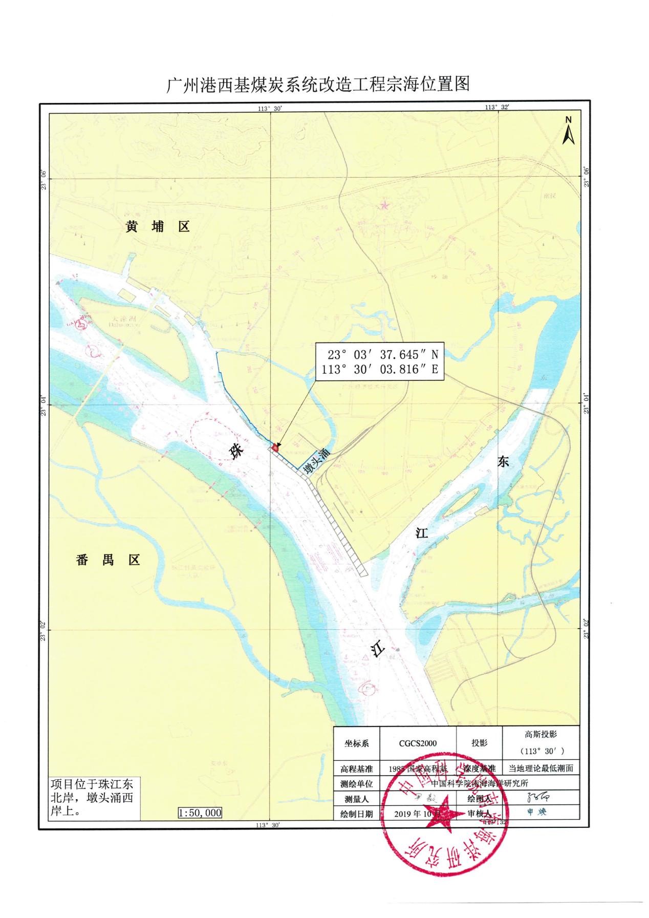 广州港西基煤炭系统改造工程项目位于广州市黄埔区,上游临近恒运电厂,下游临近墩头涌。该项目于2004年5月开工,2005年12月完工投入试运行,所在区域已被纳入围填海历史遗留问题清单。项目拟申请填海用海0.5948公顷,用途为码头堆场。