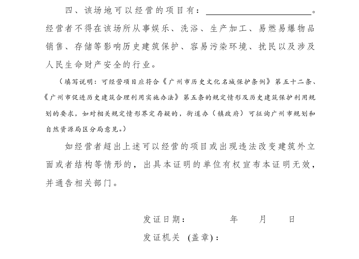 第二十六条 保护责任人按照《广州市历史文化名城保护条例》及本办法相关要求,利用历史建筑从事经营活动办理商事登记,涉及改变房屋使用用途、未取得不动产登记证明的,所在地街道办事处(镇人民政府)应当向申请人出具场地使用证明(附件3)。